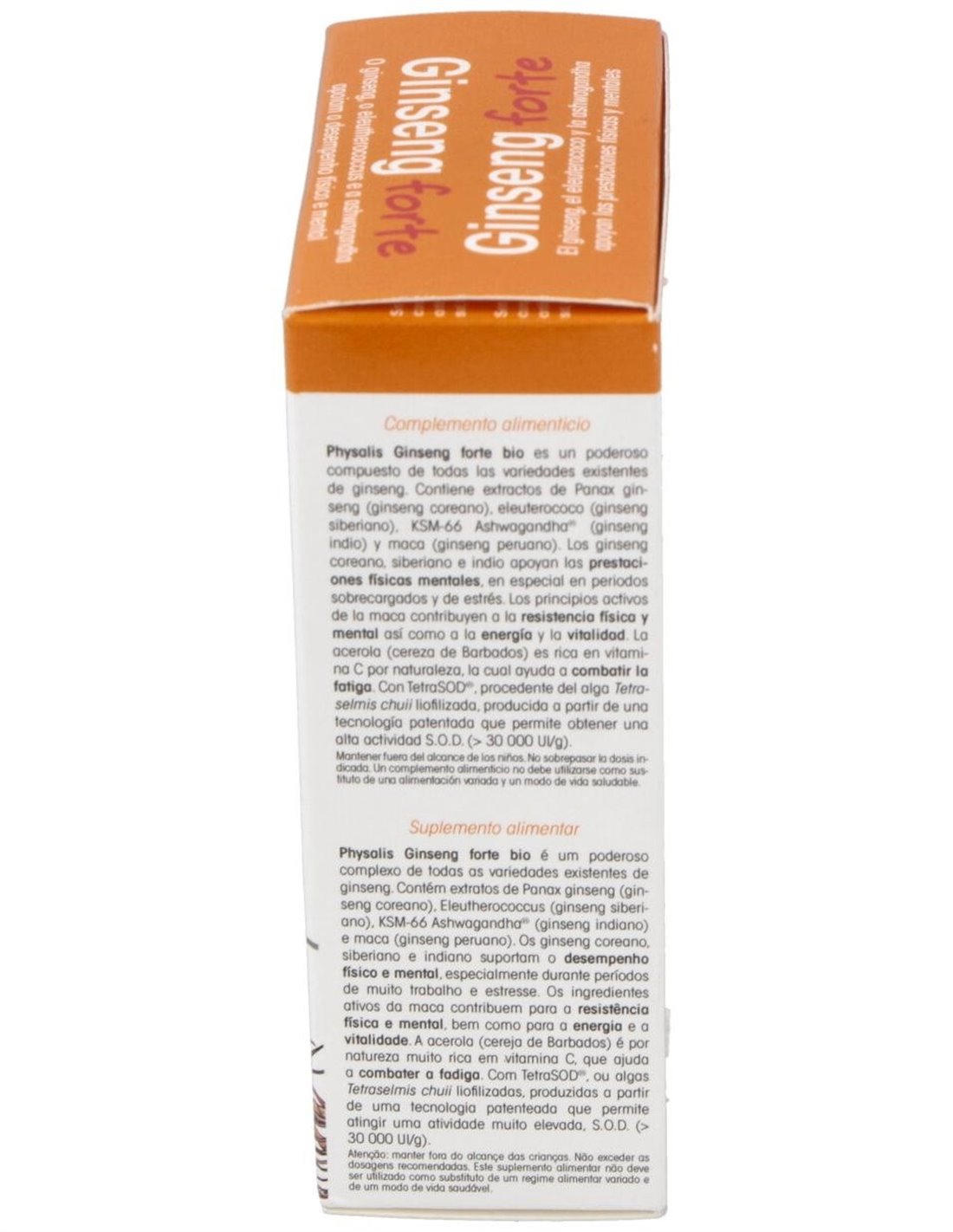 Physalis Ginseng Forte Bio 30caps es un complemento alimenticio que contribuye a mejorar la resistencia moral y física. Su composición a base de plantas naturales ayuda a combatir la fatiga en momentos puntuales donde se ejerce un sobre esfuerzo mental y/o físico.