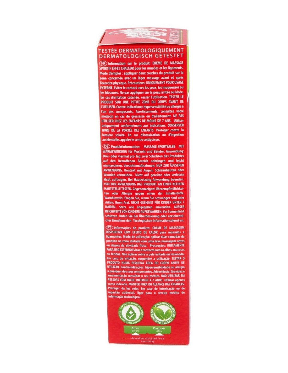 Crema de masaje con una completa fórmula que prepara, protege y recupera los músculos y ligamentos. Es altamente efectiva tanto en la práctica deportiva como contra la fatiga que genera la actividad cotidiana.