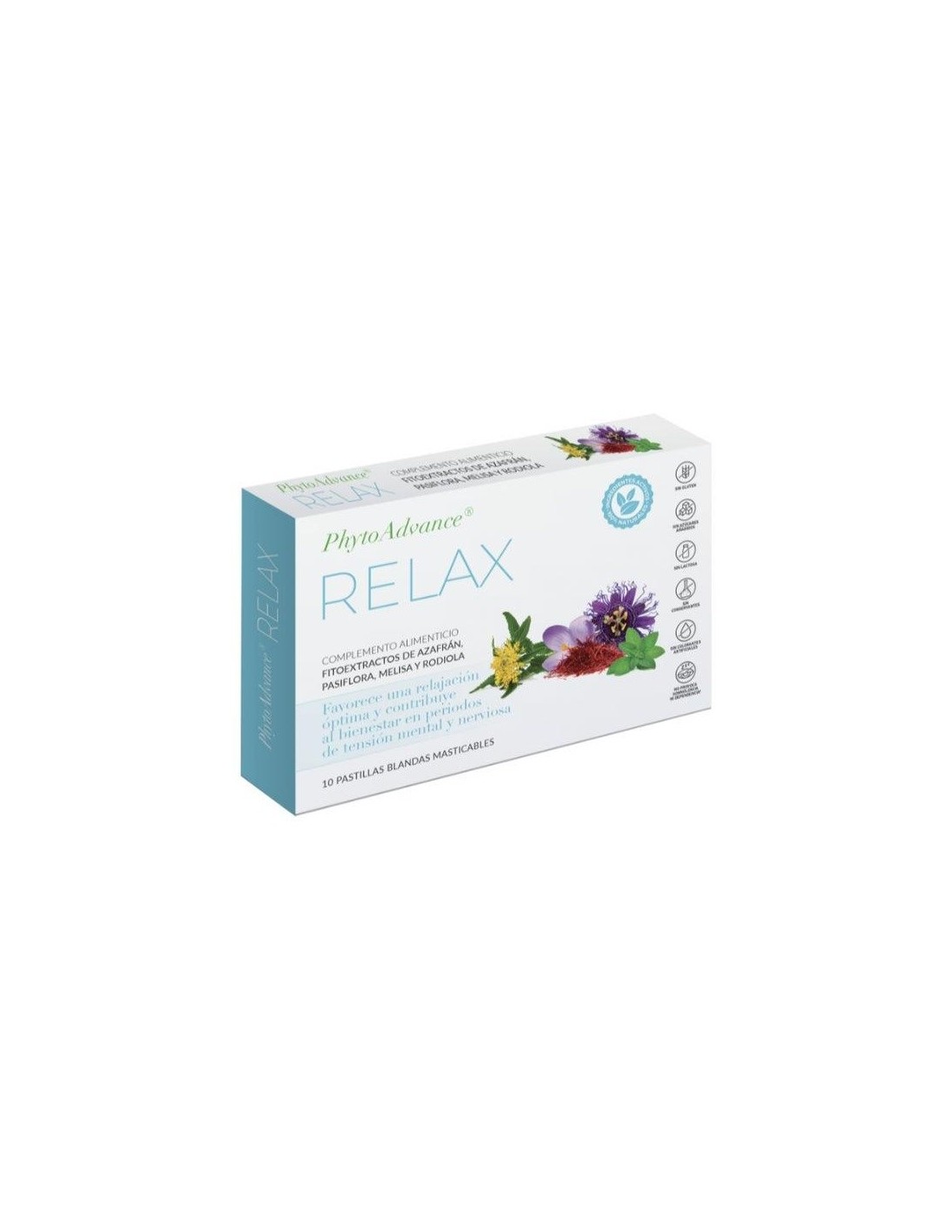 PHYTOADVANCEComplemento alimenticio con fitoextractos de Azafrán, Pasiflora, Melisa y Rodiola en forma de pastillas blandas masticables para una absorción inmediata, que\ apoyan la relajación y contribuyen al bienestar mental y físico en periodos de tensión mental y nerviosa. Alta biodisponibilidad debido a su absorción inmediata en la mucosa bucal. Sin efectos secundarios reportados.