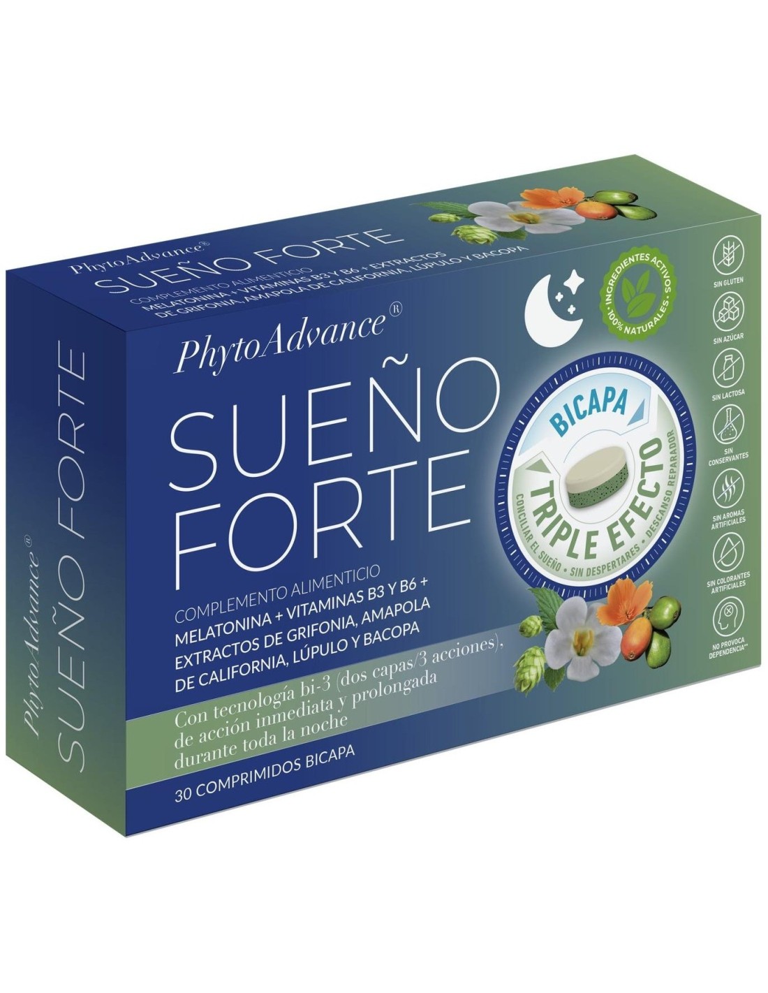 PHYTOADVANCEPhytoAdvance® Sueño Forte ayuda a conciliar rápidamente el sueño, mantenerlo durante toda la noche y despertarse descansado gracias a su composición: La melatonina contribuye a disminuir el tiempo necesario para conciliar el sueño. El efecto beneficioso se obtiene con una ingesta de 1 mg de melatonina poco antes de irse a dormir. La niacina y la vitamina B6 favorecen una función psicológica normal y ayudan a disminuir el cansancio y la fatiga. La Amapola de California mejora la calidad del sueño natural. Producto de alta biodisponibilidad, sin efectos secundarios reportados. Formato comprimidos bicapa.