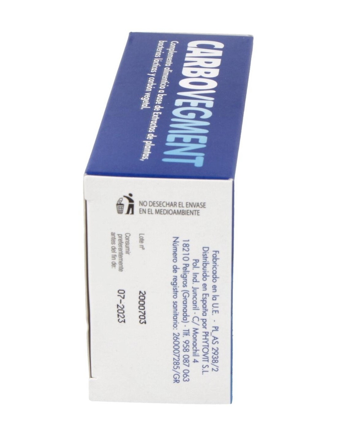 Complemento alimentario de fermentos lácticos, carbón vegetal y extractos vegetales.