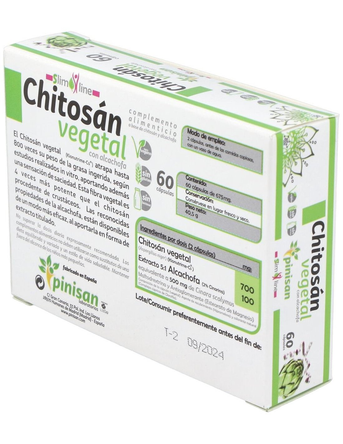 ¿Que es Chitosan Vegetal?Se trata de un nuevo ingrediente (KiOnutrime-Cs®) de origen vegetal creado como coadyuvante en las dietas de control de peso y en el control del colesterol. El Chitosan Vegetal posee una estructura equivalente al chitosán que proviene de los crustaceos, con la ventaja de ser 100% vegetal, no alérgeno y libre de metales pesados. Otra de sus ventajas reside en su eficacia, ya que gracias a sus propiedades moleculares puede atrapar 4 veces más grasa que el chitosán clásico. Además de esto, Pinisan ha añadido a su producto un extracto titulado de alcachofa, lo que convierte al producto en depurativo y quemagrasas, es decir, favorece la rápida digestión y eliminación de las grasas. ¿Como tomar Chitosan Vegetal? Se deben ingerir 2 comprimidos con abundante agua antes de las principales comidas. Esto permitira que esta fibra soluble tome volumen en nuestro estómago, absorviendo las grasas y produciendo efecto saciante. Composición activa por cápsula: