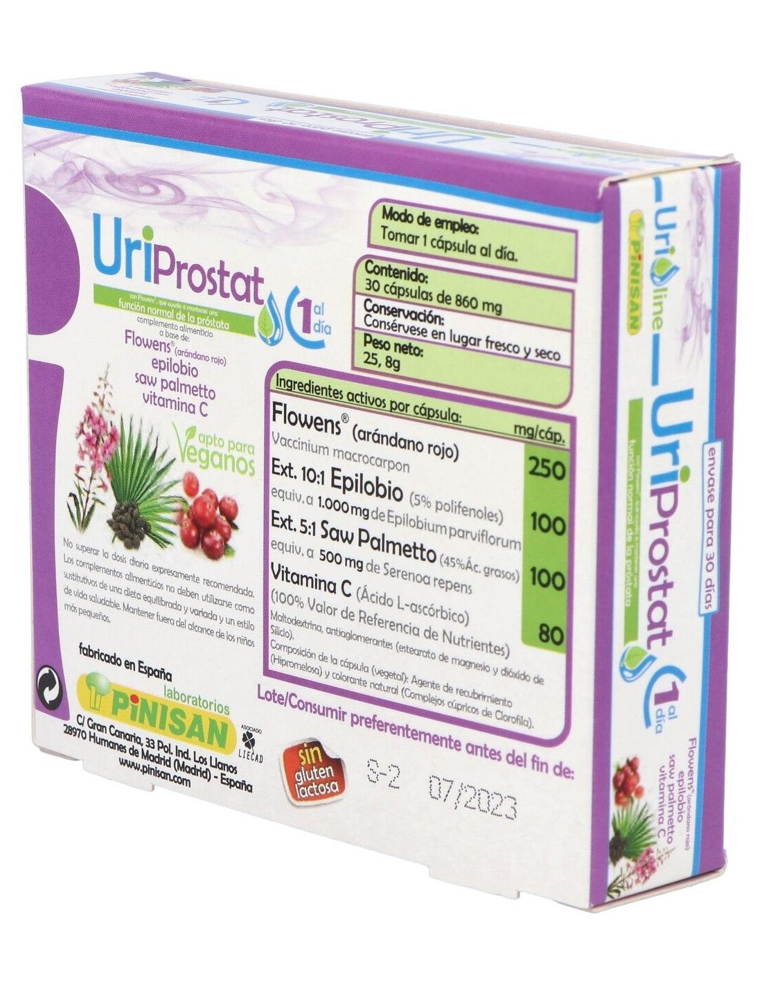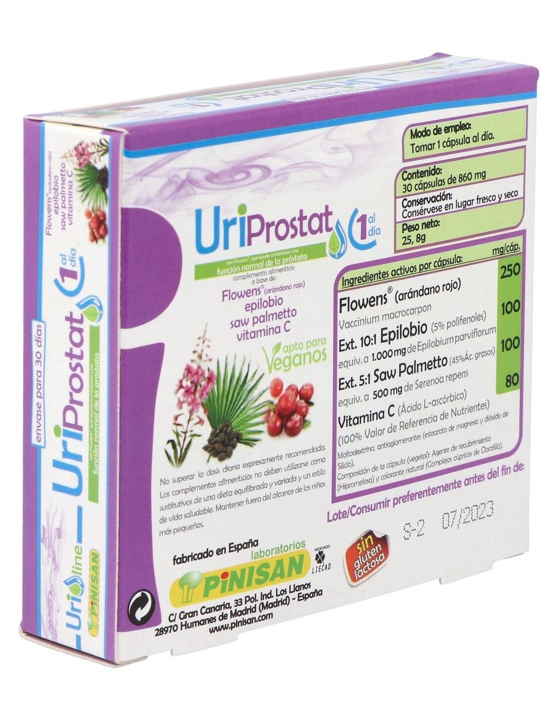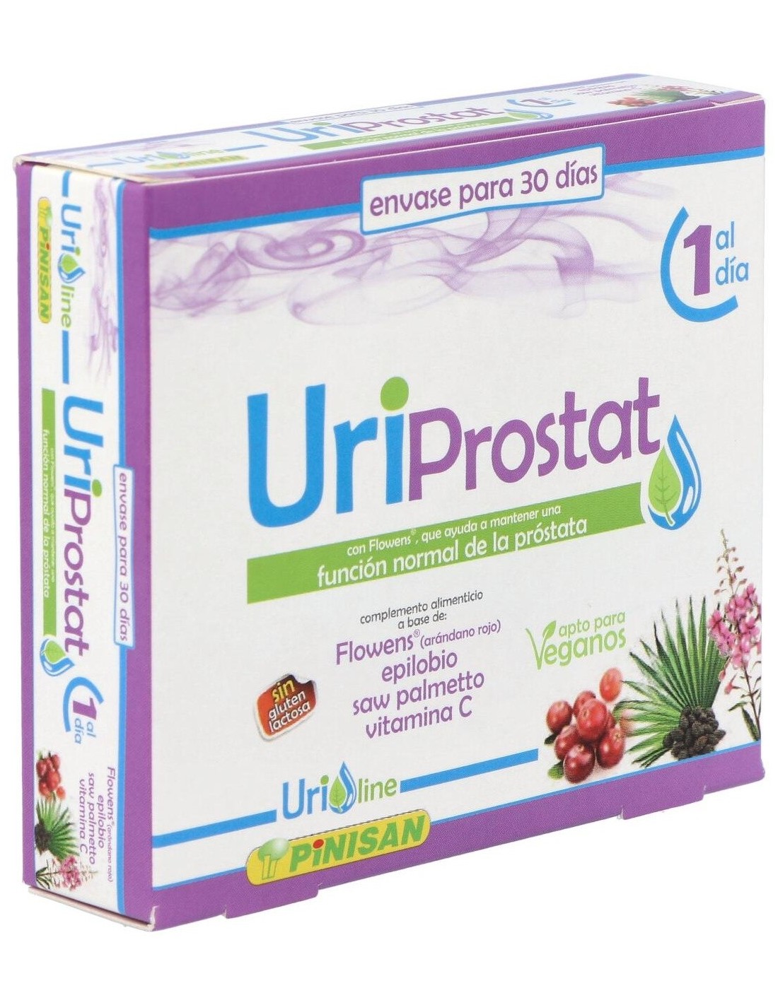 Propiedades de los principios activos:- Flowens®: Es un extracto que se obtiene del fruto entero del arándano rojo americano (Vaccinium macrocarpon L.) ofreciendo los beneficios del espectro completo del fruto. Es el único extracto de arándano que ha demostrado eficacia con estudios contrastados en la mejora de los síntomas asociados a las afecciones del tracto urinario en hombres, así como una mejora en todos los marcadores de flujo (uroflujometría), volumen de orina eliminada, volumen residual postvaciamiento, flujo urinario durante la micción. Los síntomas de mejora incluyen a los producidos tanto por hiperactividad de la vejiga (frecuencia, nicturia, urgencia miccional, incontinencia) como por hipoactividad de ésta (intermitencia miccional, flujo débil y retención urinaria). - Epilobio: Es una planta que suele crecer en casi cualquier terreno mientras tenga suficiente humedad, es de la familia de las Enoteráceas y suele encontrarse con más facilidad en montañas europeas o en Asia septentrional. El Epilobio llega a medir 2 metros de altura y puede reproducirse fácilmente debido a su masiva producción de semillas, por lo que llega a abarcar grandes superficies de terreno y suele considerarse como hierba mala. Contiene una importante cantidad de compuestos polifenólicos, como los taninos, y compuestos polisacáridos, como la pectina y el mucílago. El Epilobio ha demostrado ser un remedio beneficioso para los problemas de próstata debido a que contiene sustancias como los elagitaninos eonoteína A y B que inhiben la actividad de dos enzimas (5-alfa-reductasa y aromatasa) las cuales están directamente involucradas en la HPB (Hiperplasia prostática benigna). El epilobio posee una potente acción antiinflamatoria y también tiene efectos inhibidores de la síntesis de prostaglandinas. Estas propiedades del epilobio logran reducir el agrandamiento de la próstata, disminuir la inflamación y con ello la desaparición gradual de las molestias y los problemas para orinar. - Saw Palmetto: También llamado Sabal o Palma Enana Americana es una planta que crece en las regiones costeras del sur de los EE.UU. De su fruto se obtiene un extracto lipídico, en el que predominan los ácidos grasos, los fitoesteroles, y, en menor medida, taninos, betacarotenos y flavonoides. Los usos tradicionales de estas bayas son para problemas de retención de líquidos, problemas relacionados con la próstata (prostatitis o hiperplasia prostática benigna), alopecia androgénica, impotencia masculina, falta de líbido y cistitis. De todas estas propiedades, los estudios han demostrado que su consumo habitual determinó una menor incidencia de problemas relacionados con la inflamación de la vejiga y con prostatitis, fundamentalmente en lo que se refiere a la necesidad urgente de orinar, el escozor en la micción, la sensación de no haber vaciado completamente la vejiga y otros síntomas que se presenta en este tipo de afección. - Vitamina C: Es una vitamina soluble en agua que se encuentra en frutas y verduras. La vitamina C tiene propiedades antioxidantes y estimulante del sistema inmunológico, por lo tanto puede ayudar al organismo a combatir infecciones, incluyendo infecciones de la vejiga, ya que dificulta la colonización de bacterias patógenas en esta. Es una vitamina que no podemos producir en nuestro organismo y es necesaria aportarla a través de la dieta. Ingredientes activos por cápsula: