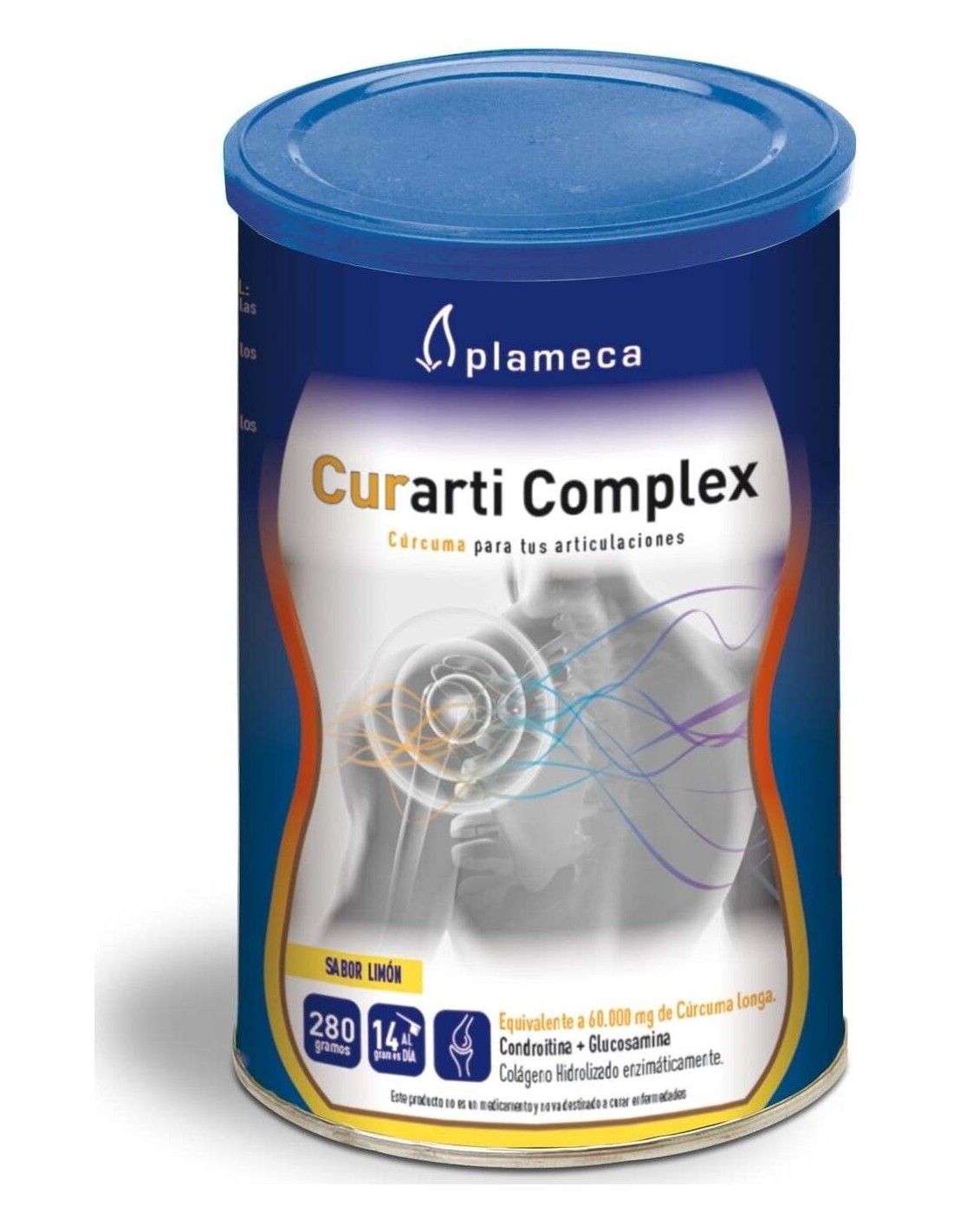 Colágeno hidrolizado enzimáticamente, Sulfato de Glucosamina 2KCl (crustáceos), Sulfato de Condroitina, Carbonato de Magnesio, Acidulante (ácido cítrico), Maltodextrina, Aroma de limón, Vitamina C (L-ascorbato sódico), Curcumina complexada (beta-ciclodextrina y extracto de raíces de Curcuma longa, estandarizado en curcumina), Ácido hialurónico (como sal sódica), Antiaglomerante (dióxido de silicio), Edulcorante (sucralosa).