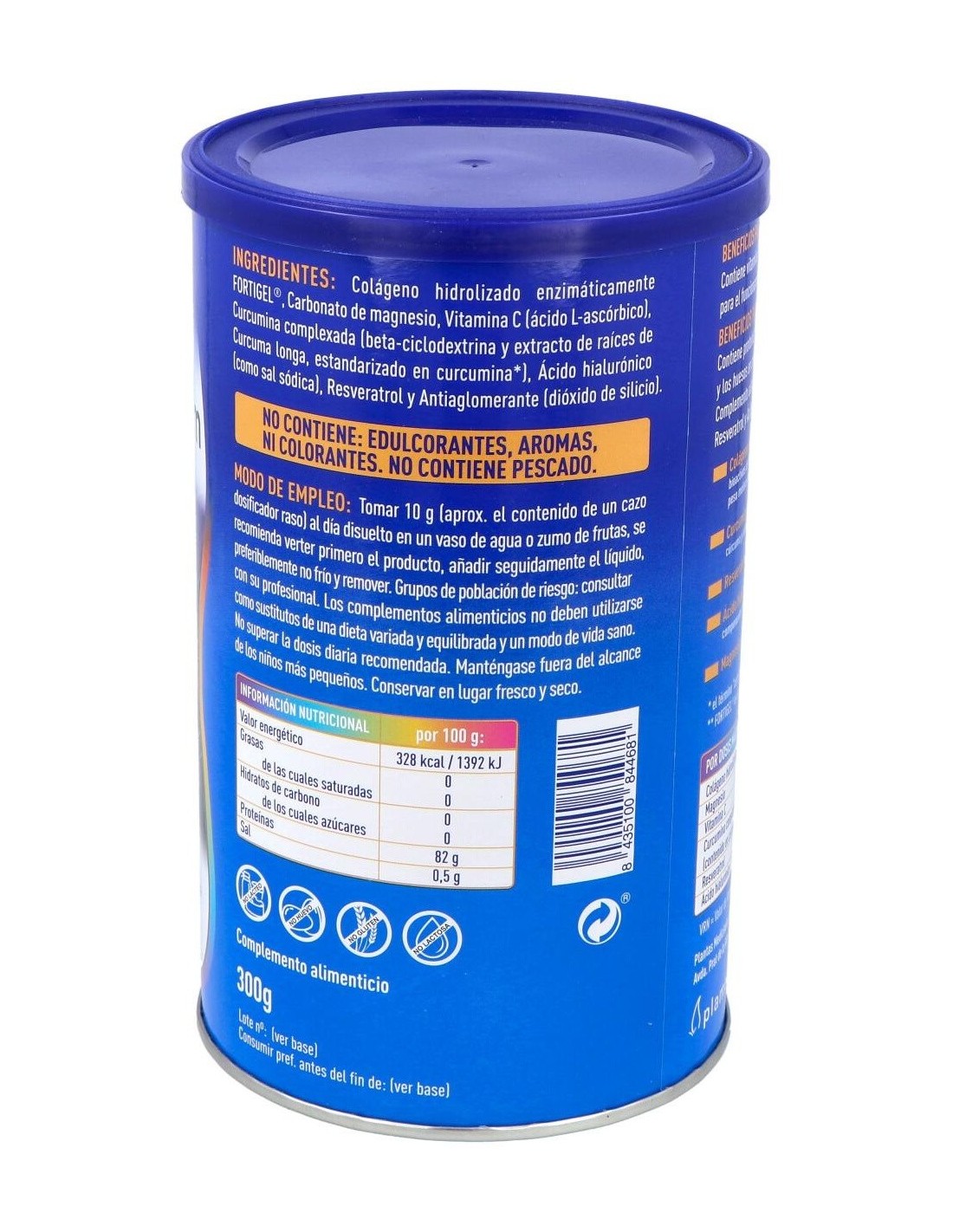 Ingredientes:Colágeno hidrolizado enzimáticamente FORTIGEL®, Carbonato de magnesio, Vitamina C (ácido L-ascórbico), Curcumina complexada (beta-ciclodextrina y extracto de raíces de Curcuma longa, estandarizado en curcumina), Ácido hialurónico (como sal sódica), Resveratrol y Antiaglomerante (dióxido de silicio).Modo de empleo:Tomar 10 gramos (aprox. el contenido de un cazo dosificador colmado) al día disueltos en un vaso de agua o zumo de frutas.Presentación:Envase de 300 gramos.Recomendación y advertencias:No contiene gluten ni lactosa.