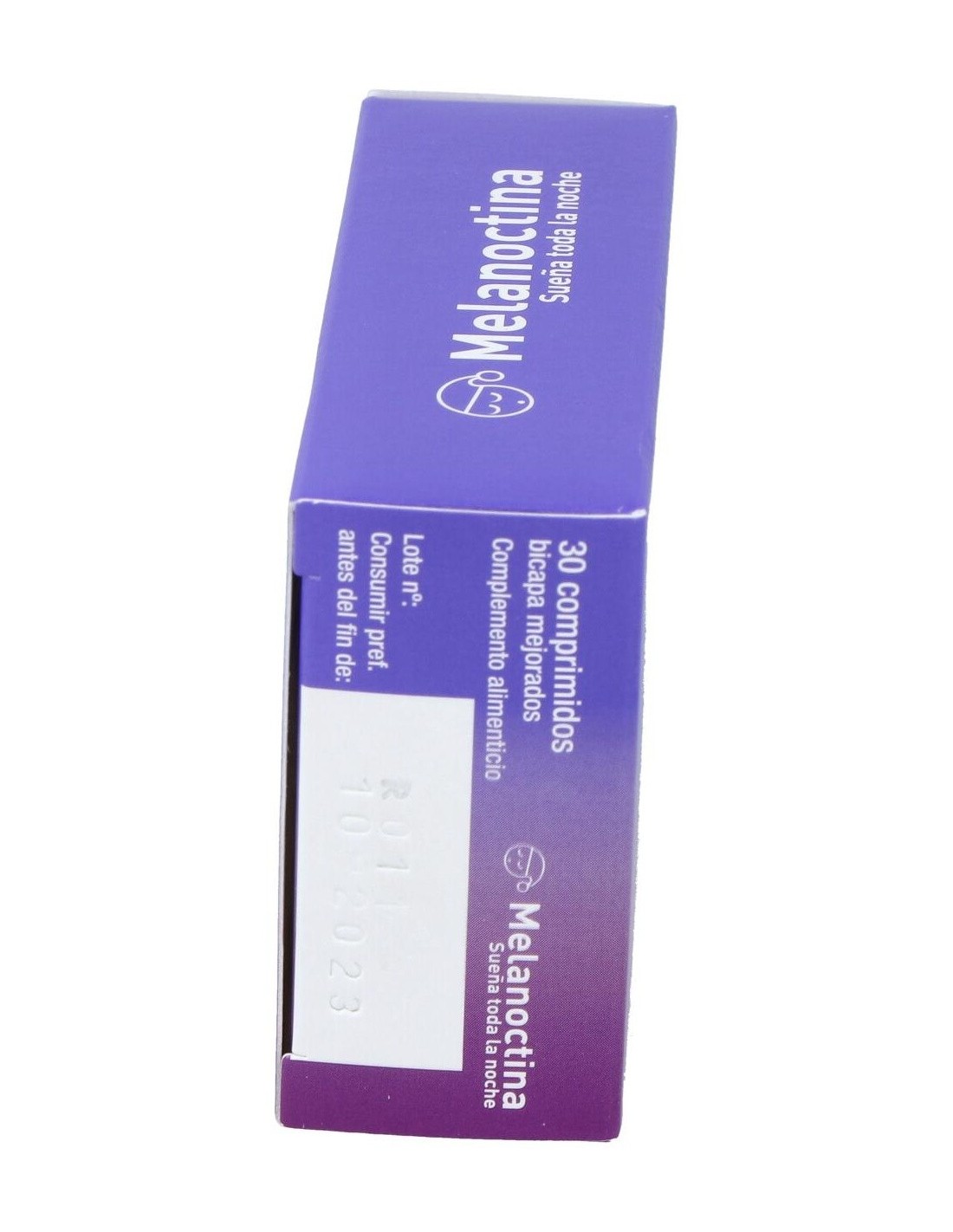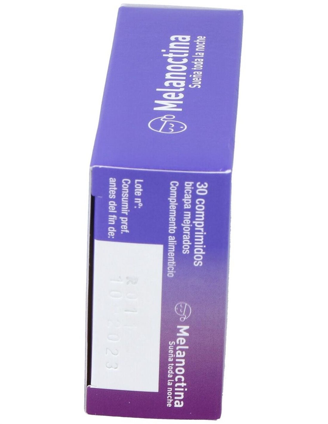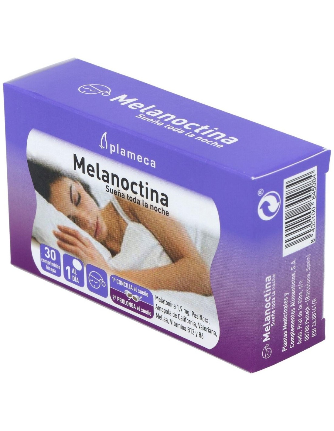 Ingredientes:Agente de carga (celulosa), Aceite vegetal hidrogenado, Extracto seco de flores de pasiflora (Passiflora incarnata) 4% flavonoides. Extracto seco de amapola de California (Eschscholzia californica), Extracto seco de raíz de valeriana (Valeriana officinalis) 0,4% ácidos valerénicos, Extracto seco de melisa (Melissa officinalis) 2,5% ácido rosmarínico, Estabilizante (hidroxipropilmetilcelulosa), Antiaglomerante (dióxido de silicio), Colorante (dióxido de titanio), Estabilizantes (talco, hidroxipropilcelulosa), Agente de carga (glicerina), Melatonina, Cloridrato de piridoxina, Cianocobalamina.Modo de empleo:Toma 1 comprimido al día media hora antes de ir a dormir. Aunque Melanoctina es segura para la mayoría, recomendamos consultar a un médico si estás embarazada, en periodo de lactancia o tomando medicamentos. Evita su uso junto con sedantes para prevenir excesiva somnolencia.Presentación:Envase de 30 comprimidos.