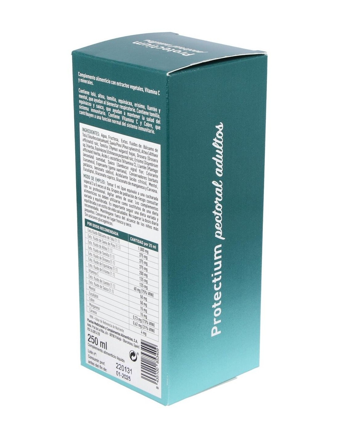 Ingredientes:Agua, Fructosa, Extos. fluidos de: Bálsamo de Tolú (Toluifera balsamum), Savia Pino (Pinus sylvestris), Altea (Althaea officinalis) raíz, Tomillo (Thymus vulgaris) hojas, Drosera (Drosera sp.) hierba, Equinácea (Echinacea purpurea) raíz, Erísimo (Sisymbrium officinale) hierba, Ácido L-ascórbico (Vitamina C), Llantén (Plantago lanceolata) sumidad, Saúco (Sambucus nigra) flor; Colorante (caramelo), Espesante (goma xantana), Conservadores (sorbato potásico, benzoato sódico), Acidulante (ácido cítrico), Mentol, Eucaliptol, Gluconato cúprico, Gluconato de manganeso y Carvona.Modo de empleo:Tomar 5 ml de 3 a 5 veces al día. Presentación:Envase de 250 ml.