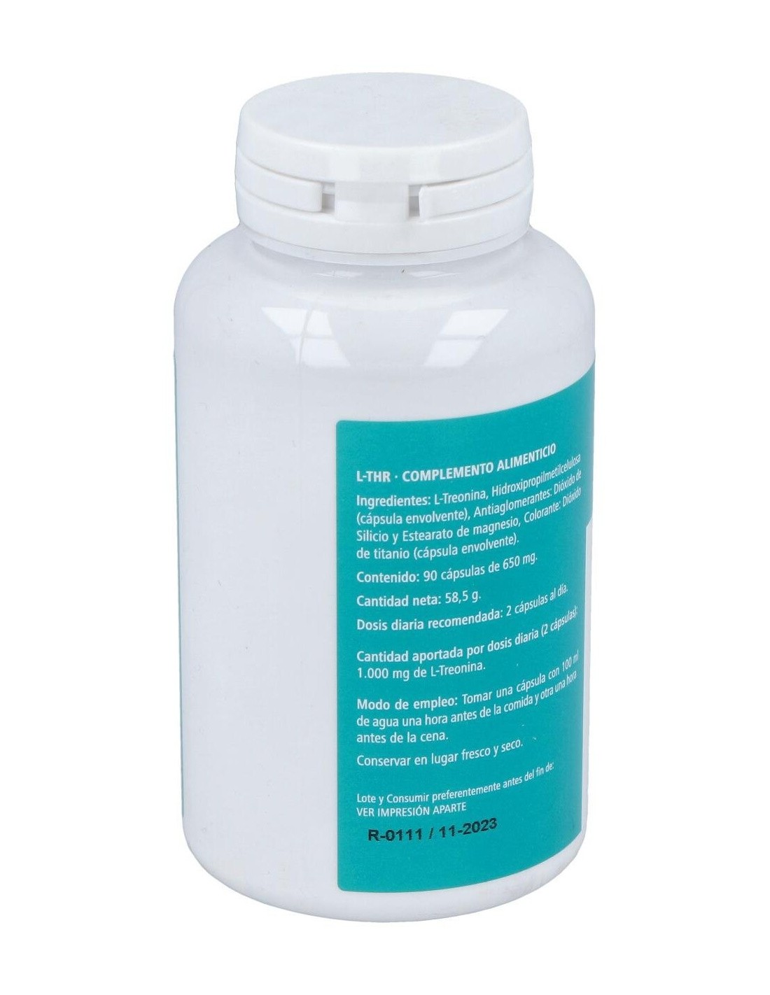 - Cada cápsula contiene L-Treonina, un aminoácido que contribuye a la síntesis proteica y al mantenimiento de tejidos corporales.
