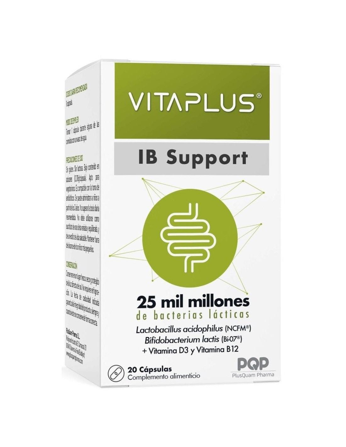 Vitaplus® IB Support es un complemento alimenticio en forma de cápsula, centrado en los días de dolor luego de la colonoscopia y el síndrome del intestino irritable. Tiene una concentración de 25 mil millones de bacterias del ácido láctico que junto a vitamina B12 y la vitamina D3, hacen posible su rápido efecto en el tracto intestinal. En términos de eficacia, PlusQuam Vitaplus® IB Support es un suplemento que ayuda a: el mejoramiento sintomático de los trastornos funcionales del intestino (TIF). Disminución de la hipersensibilidad en las vísceras y del malestar abdominal vinculados al síndrome del intestino irritable (SII), disminución de los días con dolor a partir de la colonoscopia. Compatible con los antibióticos. Adecuado a partir de los 3 años de edad. Aplicable a los celíacos, los diabéticos y los intolerantes a la lactosa.