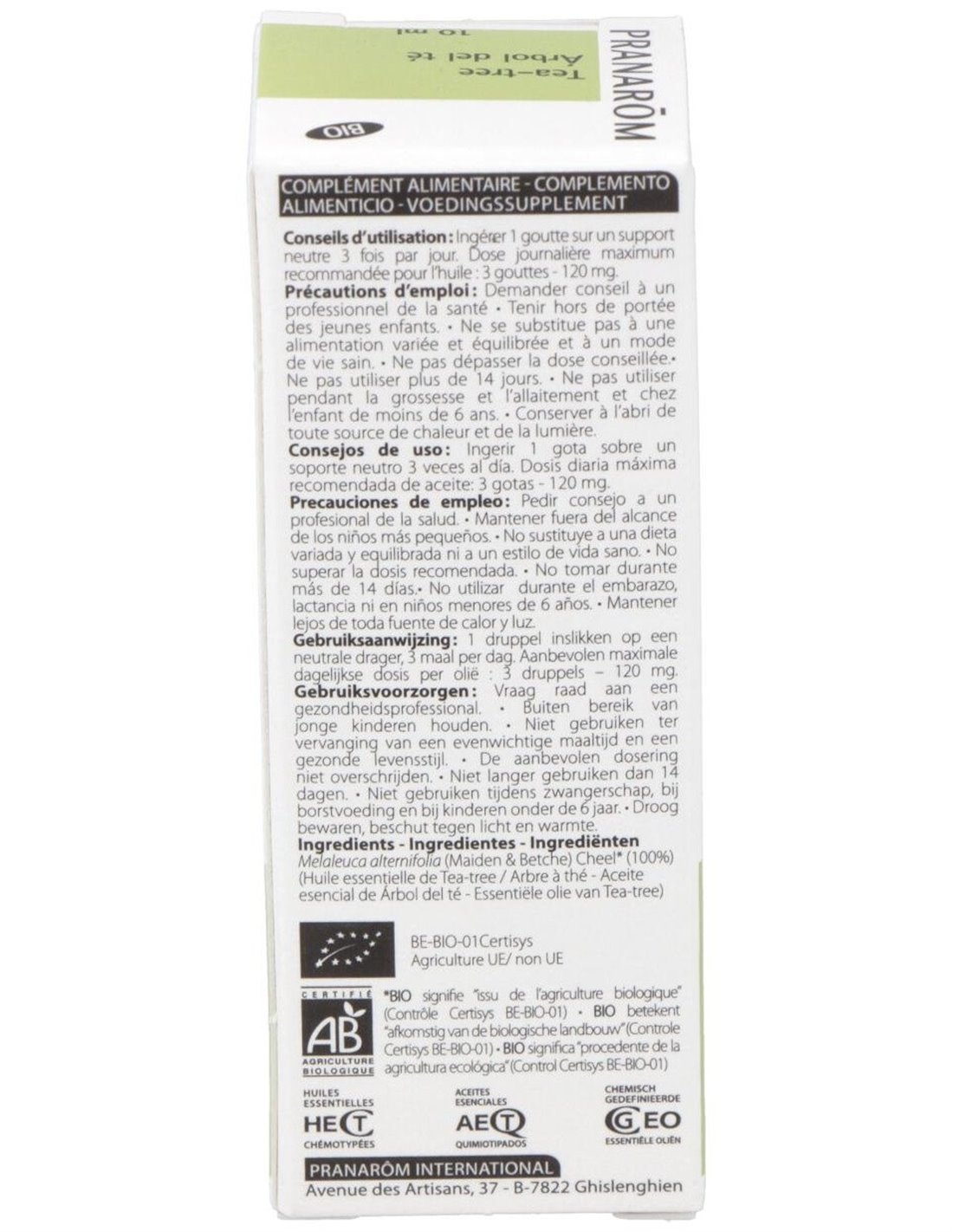 Pranarôm aceite esencial del árbol del té BIO 10ml es un aceite esencial con un gran campo de acción, siendo antibacteriano, antiséptico, fungicida, antiparasitario, antiviral, así como un gran estimulador inmunitario. Asimismo, ayuda a prevenir las quemaduras cutáneas y a calmar los síntomas de infecciones, ya sean urinarias y ginecológicas, bucales o parasitarias. Debido a sus versátiles propiedades, el aceite de árbol del té se encuentra en un gran número de productos de higiene corporal (jabón, champú, aceite de baño) y cosméticos.