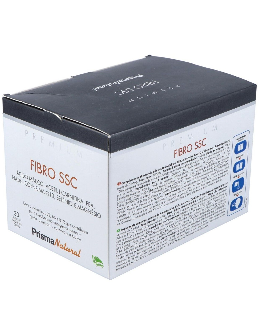 L-glutamina 4 g, ácido málico 1,2 g, acetil L-carnitina 1 g, PEA (palmitoiletanolamida) 800 mg, óxido de magnesio 199 mg (120 mg de magnesio), coenzima Q10 (ubiquinona) 100 mg, NADH (beta-nicotinamida adenina dinucleótido) 5 mg, vitamina B6 (clorhidrato de piridoxina) 2,8 mg, riboflavina (vitamina B2) 2,8 mg, tiamina (clorhidrato de tiamina) 2,2 mg, selenito de sodio 0,244 mg (0,110 mg de selenio), vitamina B12 (cianocobalamina) 5 µg.