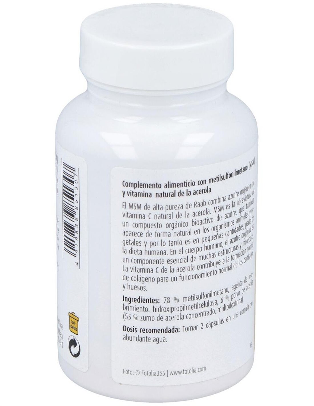 Suplemento dietético con metilsulfonilmetano (MSM) y vitamina C natural de acerola. Apto para veganos.