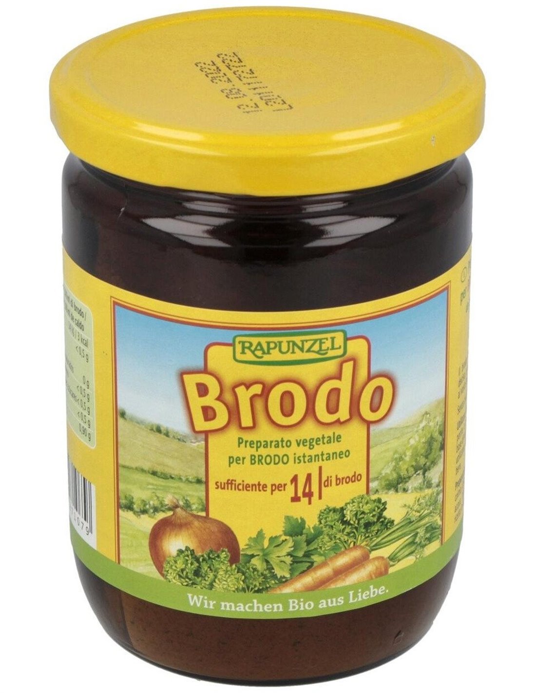 Ingredientes:Sal marina, harina de arroz integral*, jarabe de almidón de maíz*, extracto de levadura*, zanahoria*, aceite de girasol*, cebolla*, APIO*, chirivía*, cebollas asadas*, cúrcuma*, perejil*, macis*, pimienta*, laurel*, hojas de levístico*. (*) De cultivo ecológico.Valor nutricional por 100 gramos: