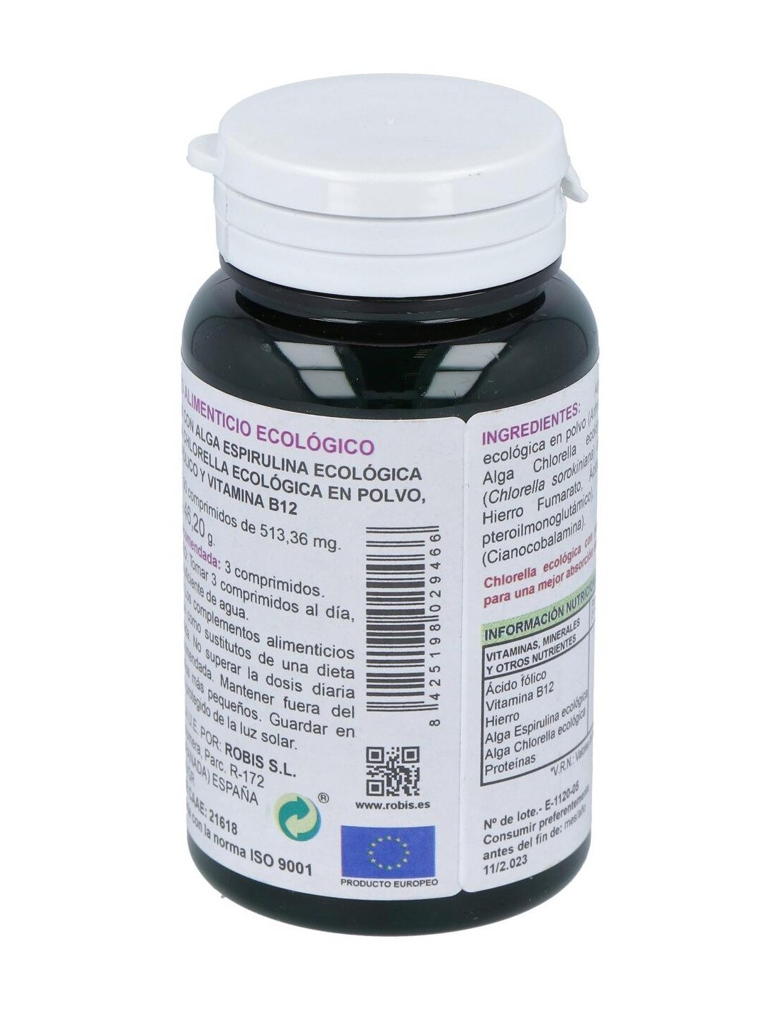 El producto está elaborado con ingredientes procedentes de cultivos controlados bajo normativas ecológicas, garantizando un perfil limpio y natural. Su formato en comprimidos permite una dosificación sencilla y adecuada para quienes prefieren suplementos en esta presentación.