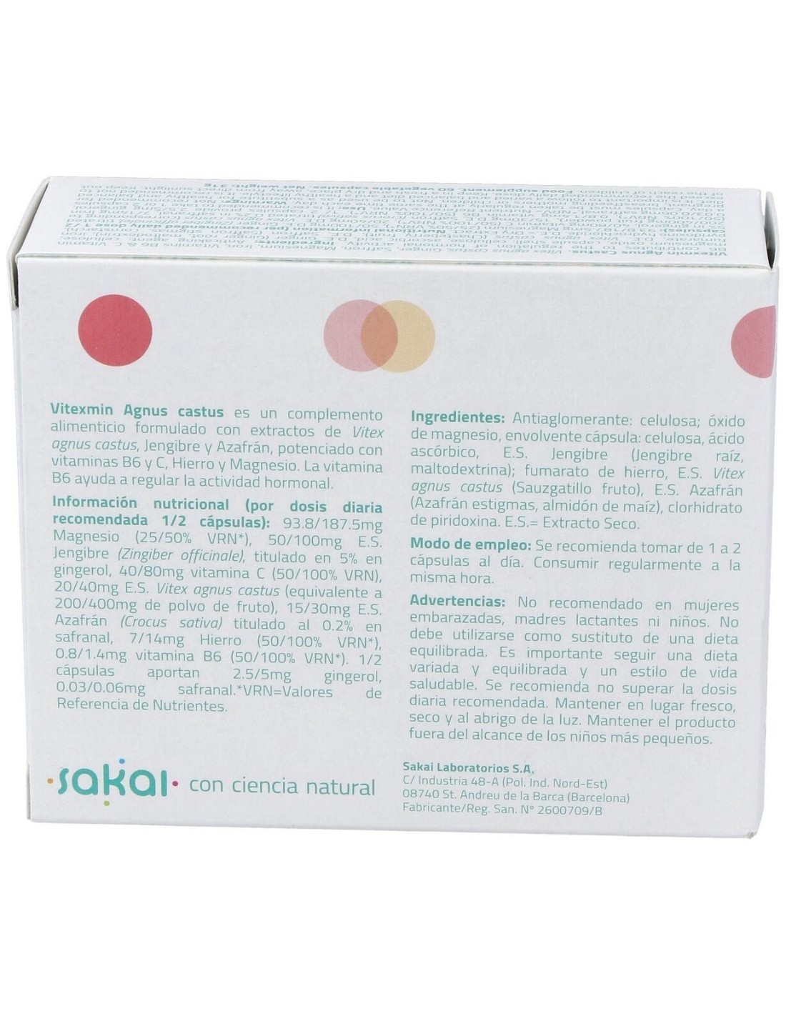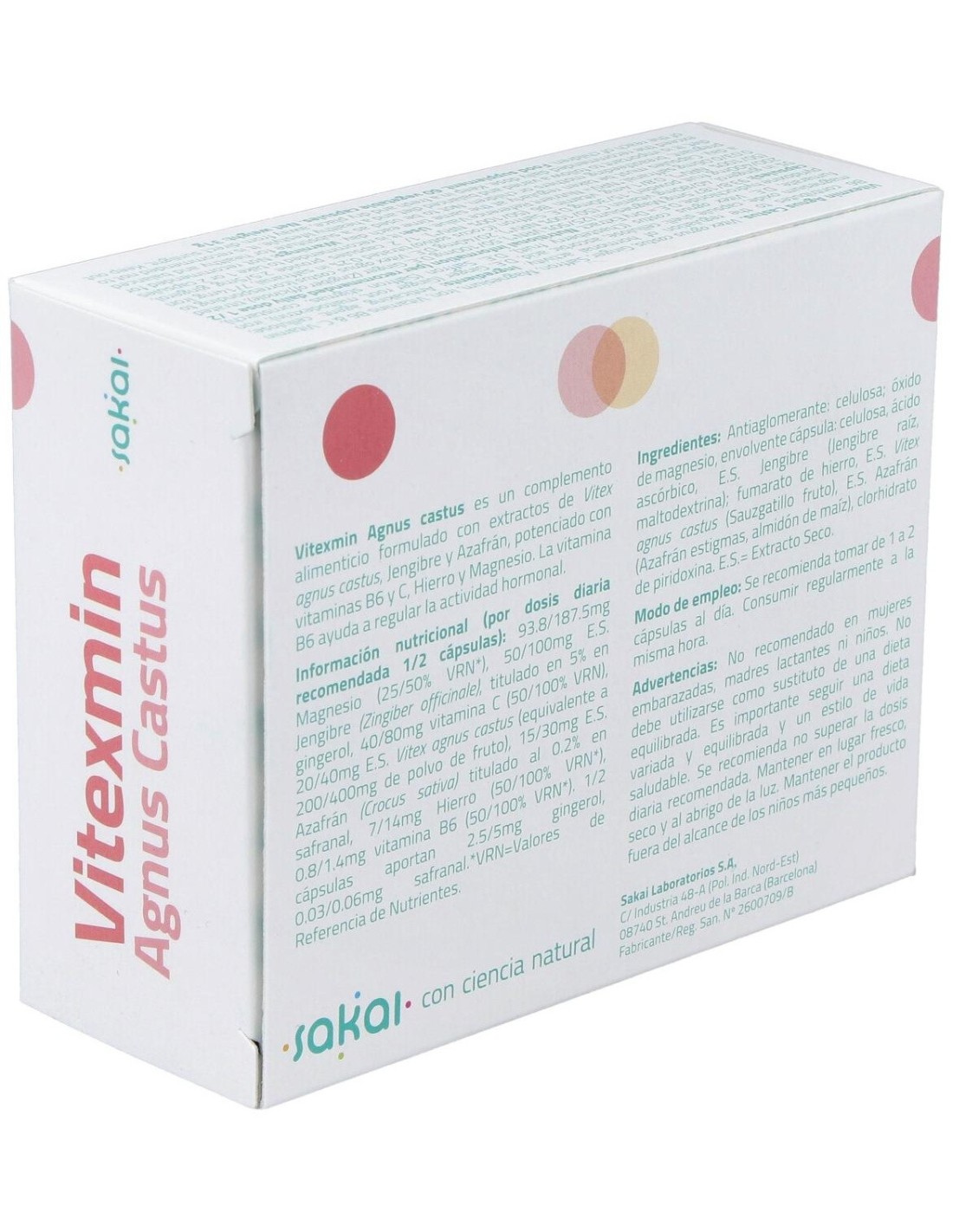 Vitexmin Agnus Castus 60Cap. de Sakai es un suplemento natural dirigido a mujeres que buscan apoyo en el equilibrio hormonal, formulado con extracto de Vitex agnus-castus para favorecer el bienestar femenino.