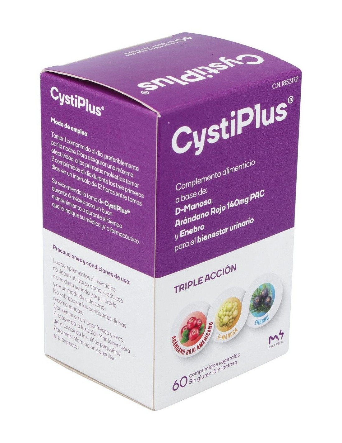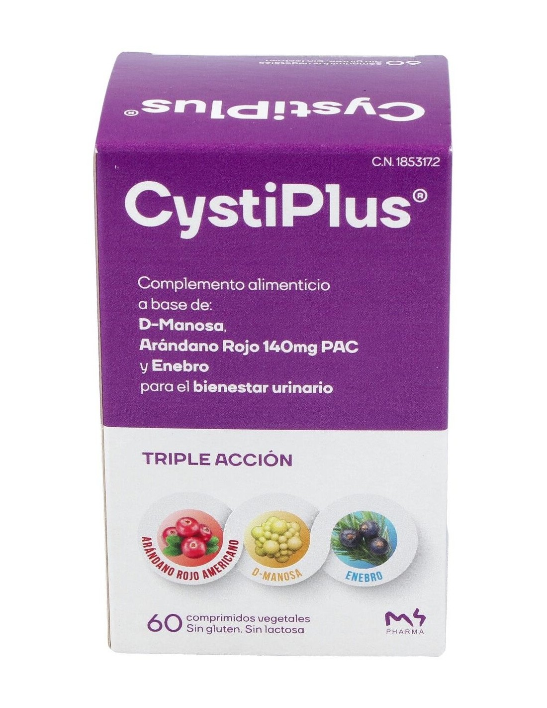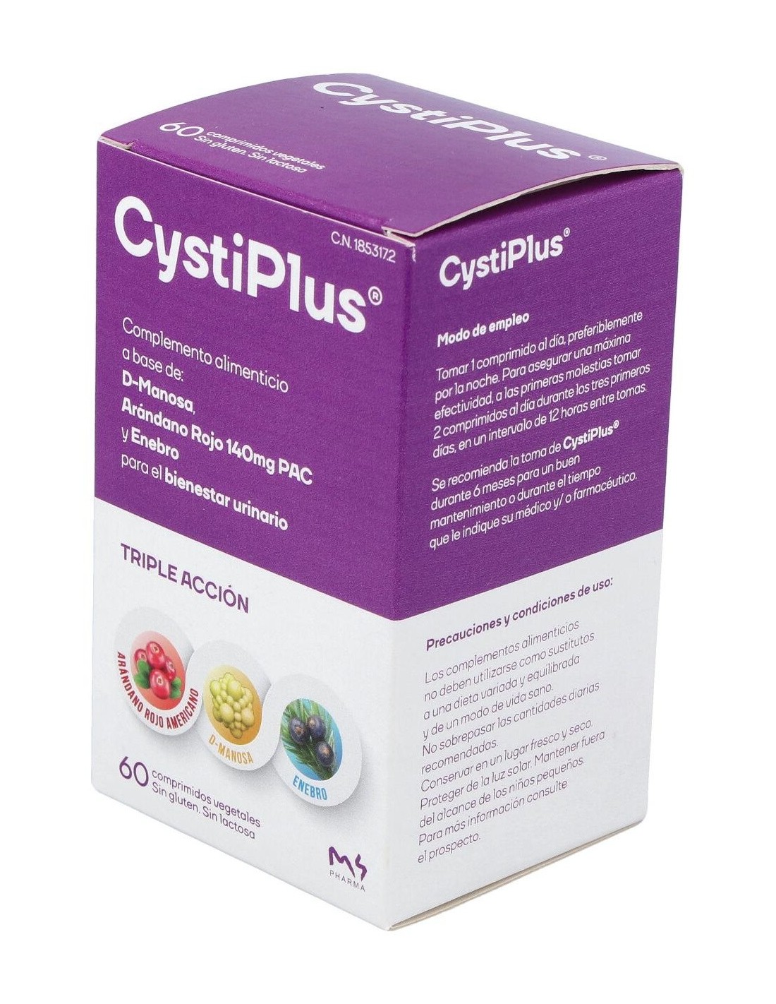 Ingredientes:D-manosa, extracto seco de arándano rojo americano (Vaccinum macrocarpon) titulado al 80% en proantocianidinas, Agente de carga: celulosa microcristalina, extracto seco de enebro (Juniperus communis), Agente de carga: fosfato cálcico dibásico, Disgregante: glicolato sódico de almidón, Antiaglomerantes: dióxido de silicio y estearato de magnesio.Modo de empleo:Como prevención de infecciones recurrentes tomar 1 comprimido de al día durante 6 meses. A los primeros síntomas y molestias para una acción y rápida tomar 2 comprimidos al día, en intervalos de 12 horas entre tomas. Si suele tener infección postcoital tome siempre 1 antes o después y otro, transcurridas 12 horas.Presentación:Envase de 60 comprimidos.Recomendaciones y advertencias:No contiene gluten ni lactosa.