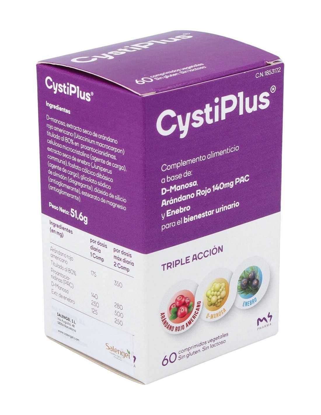 Cystiplus de Salengei es un complemento alimenticio a base de arándano rojo 140 mg PAC (proantocianidinas), D-manosa, y enebro para el bienestar urinario. Gracias a sus ingredientes de origen natural Cystiplus® aporta la máxima prevención gracias a su fórmula de triple acción, con una concentración eficiente que actúa de forma sinérgica para prevenir e inhibir la adhesión de las bacterias a las mucosas y células uroteliales.Indicaciones: