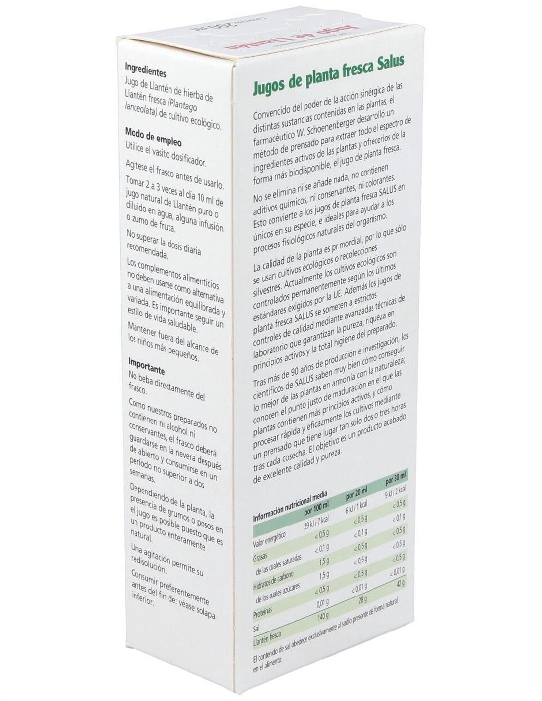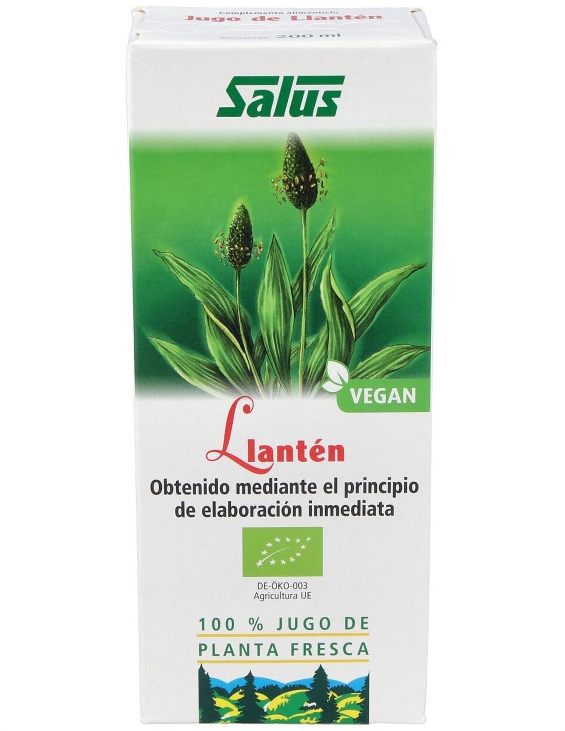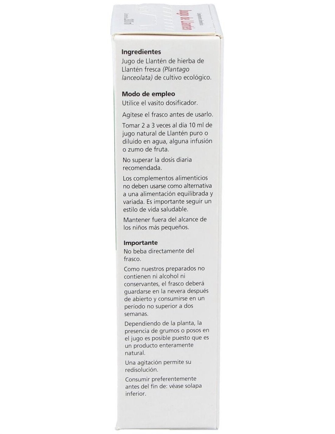 Ingredientes: Jugo natural de planta fresca de hierba de llantén de cultivo ecológico. Modo de empleo:Tomar de dos a tres veces al día 10 ml de jugo natural de llantén puro o diluido en agua o en alguna infusión. Presentación:Frasco de 200 ml.