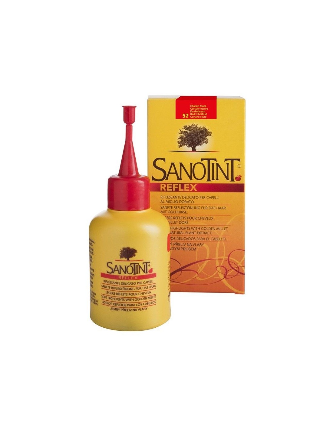 Sanotint Reflex es un producto a base de plantas con extractos de manzanilla, quino, hojas de olivo y mijo dorado que interactúan entre sí y dan reflejos brillantes y vivos al cabello creando diferentes tonos desde el negro hasta el rojo intenso cálido. Al no ser un tinte, los pigmentos del reflejo no penetran en el cabello, sino que solo recubren la parte externa del mismo, por lo que el color se elimina gradualmente en 5 a 6 lavados.Sanotint Reflex cubre delicadamente el cabello blanco, pero no de manera permanentemente como un tinte. Sanotint Reflex está listo para usar. No es necesario mezclar los componentes antes de la aplicación.Ingredientes (INCI):Plant Extracts Of Chamomile, Golden Millet, Olive Leaf (Aqua, Methoxyisopropanol, Cocamidopropyl Betaine, Hydroxyethylcellulose, Parfum, Laurdimonium, Hydroxypropyl, Hydrolyzed Wheat Protein, Polyquaternium-22, Propylene Glycol, Sodium Hydroxide, Pantoxide Acetate Extract, Panthopropylene Pantoxide, Panthodium Pantoxide Acetate Extract, Sodium Extract, Sodium Pacoxide Acetate, Sodium Pantoride Extract And Hydrochloric Acid, Olea Europaea Leaf Extract, Cinchona Extract, Chamomilla Recutita Extract, Butylparaben, Ethylparaben, Propylparaben, Methylparaben, Phenoxyethanol, Sorbic Acid, Caprylyl Glycol, Linalool).Modo de empleo:Seguir atentamente las instrucciones que encontrará en el interior.Presentación:El envase contiene: