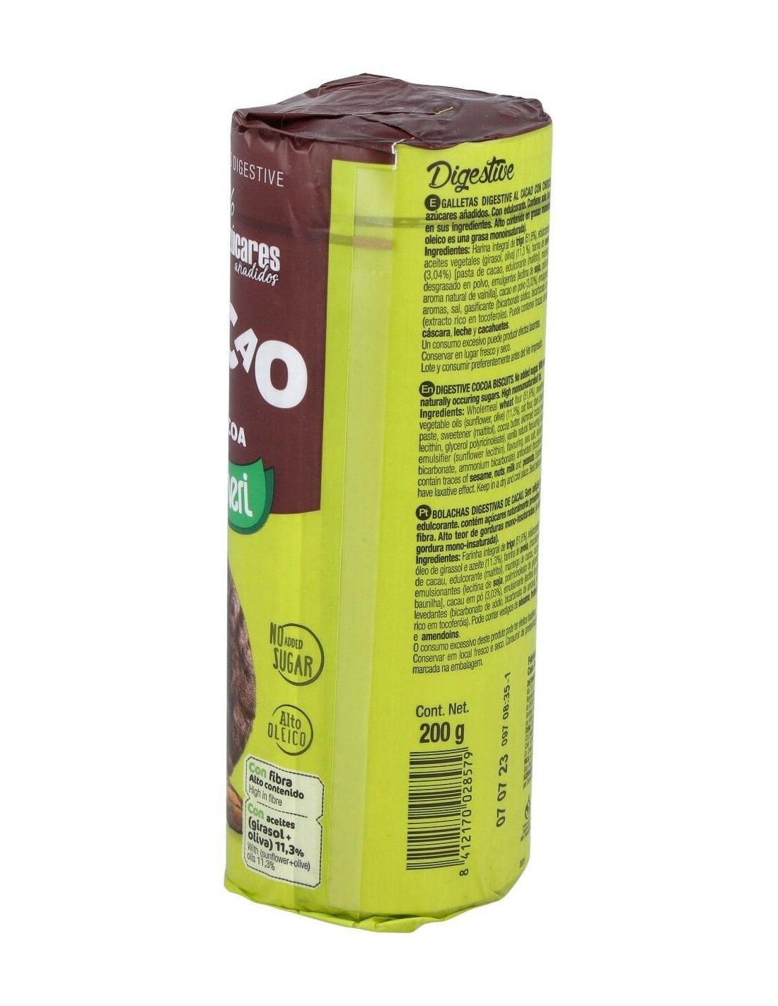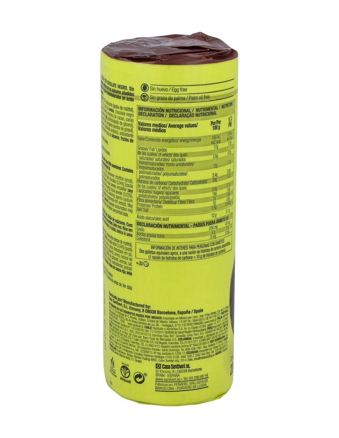 Harina integral de trigo (47.1%), edulcorante (maltitol, acesulfamo), grasa vegetal no hidrogenada (12.5%), cacao en polvo (5.5%), harina de avena, sal, emulgente (lecitina de soja), aromas, gasificantes (bicarbonato sódico, bicarbonato amónico), colorante (caramelo), antioxidante (extractos ricos en tocoferoles vitamina E-), ácido fólico.