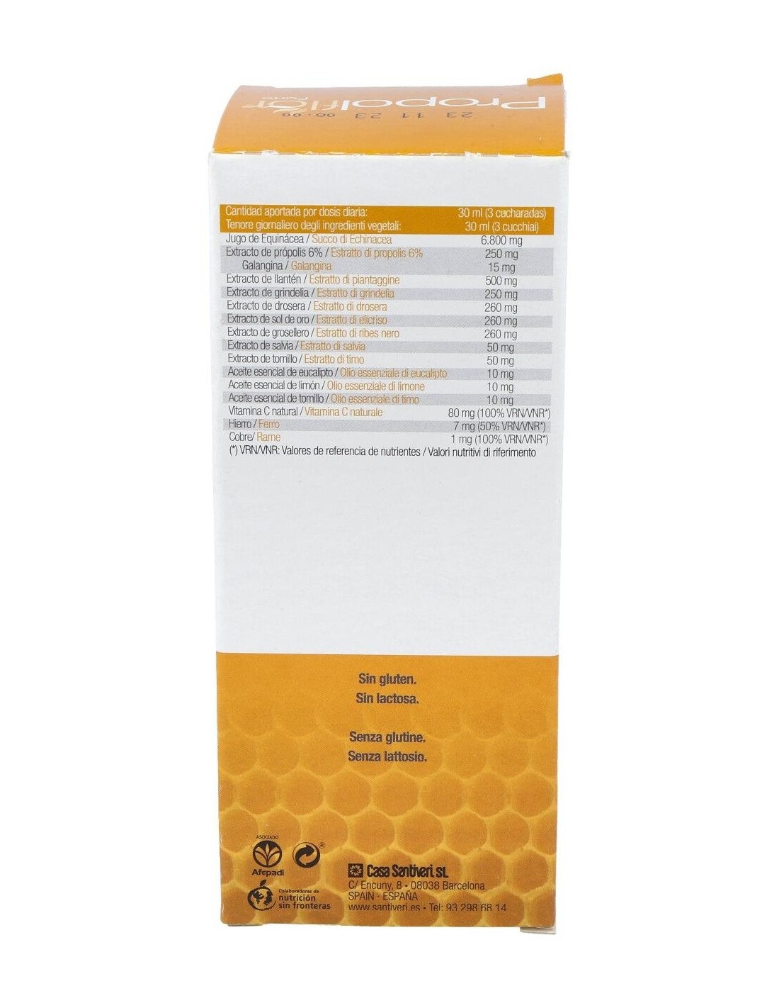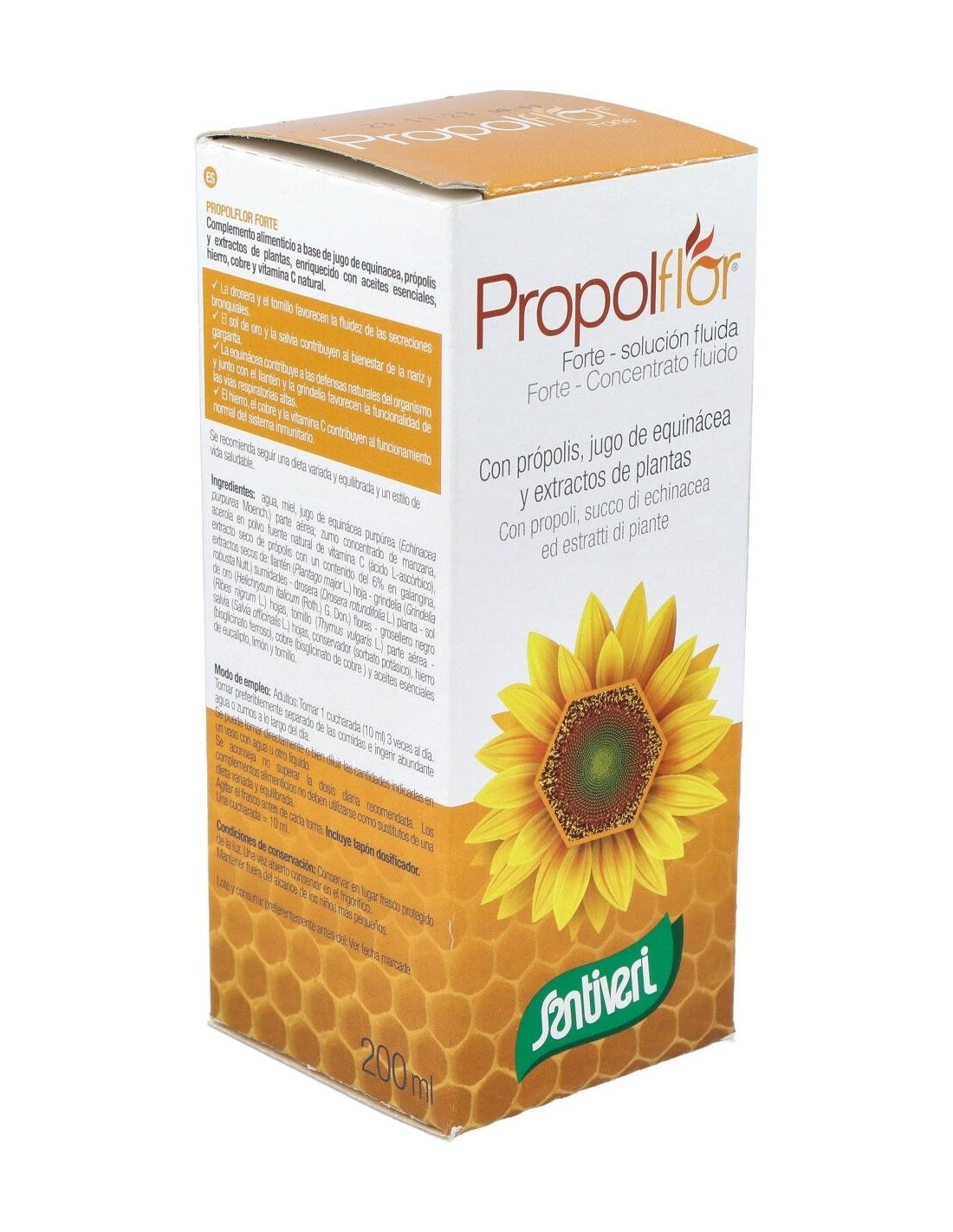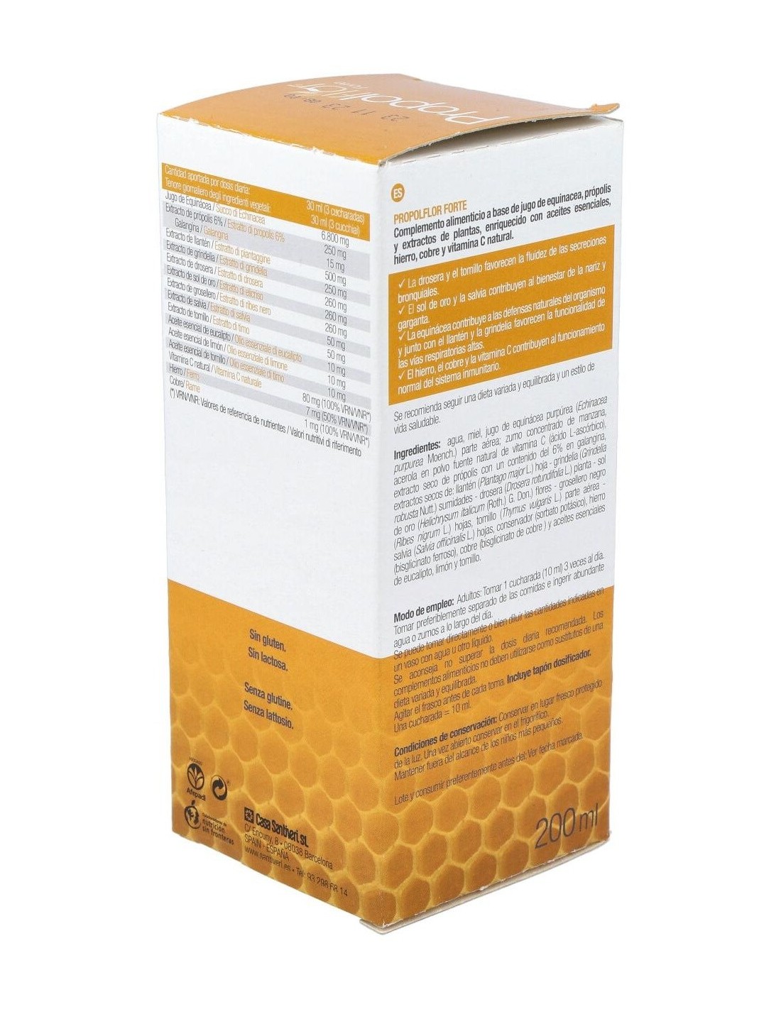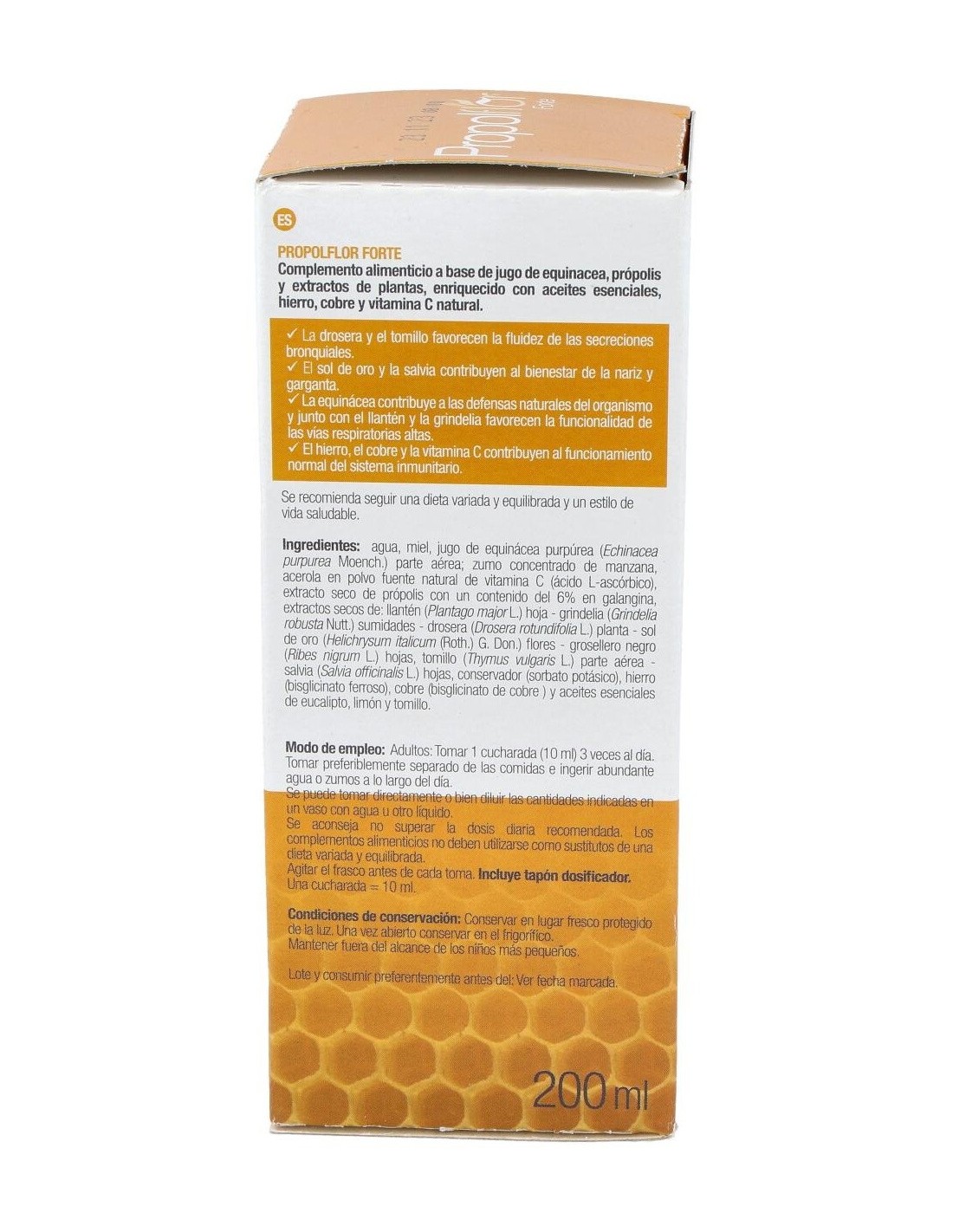 Agua, miel, jugo de equinácea purpúrea (Echinacea purpurea Moench.) parte aérea: zumo concentrado de manzana, acerola en polvo fuente natural de vitamina C (ácido L-ascórbico), extracto seco de própolis con un contenido del 6% en galangina, extractos secos de: llantén (Plantago major L.) hoja - grindelia (Grindelia robusta Nuttal) sumidades - - drosera (Drosera rotundifolia L.) planta - sol de oro (Helichrysum italicum (Roth.) G. Don.) flores - grosellero negro (Ribes nigrum L.) hojas - tomillo (Thymus vulgaris L.) parte aérea - salvia (Salvia officinalis L.) hojas, conservador (sorbato potásico), hierro (gluconato ferroso), cobre (gluconato cúprico) y aceites esenciales de eucalipto, limón y tomillo.
