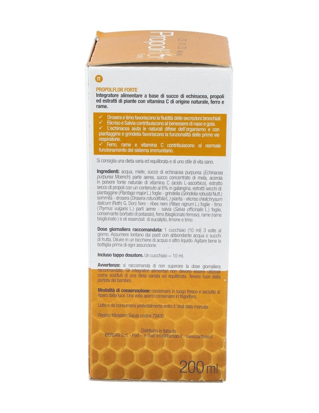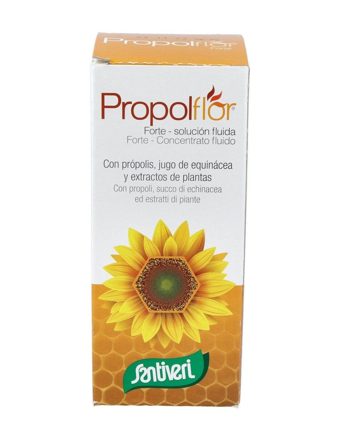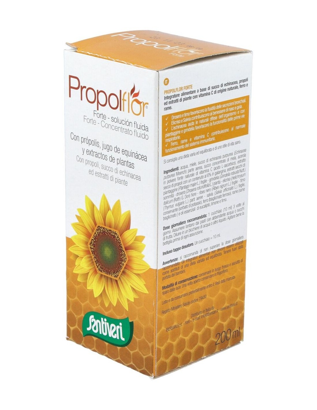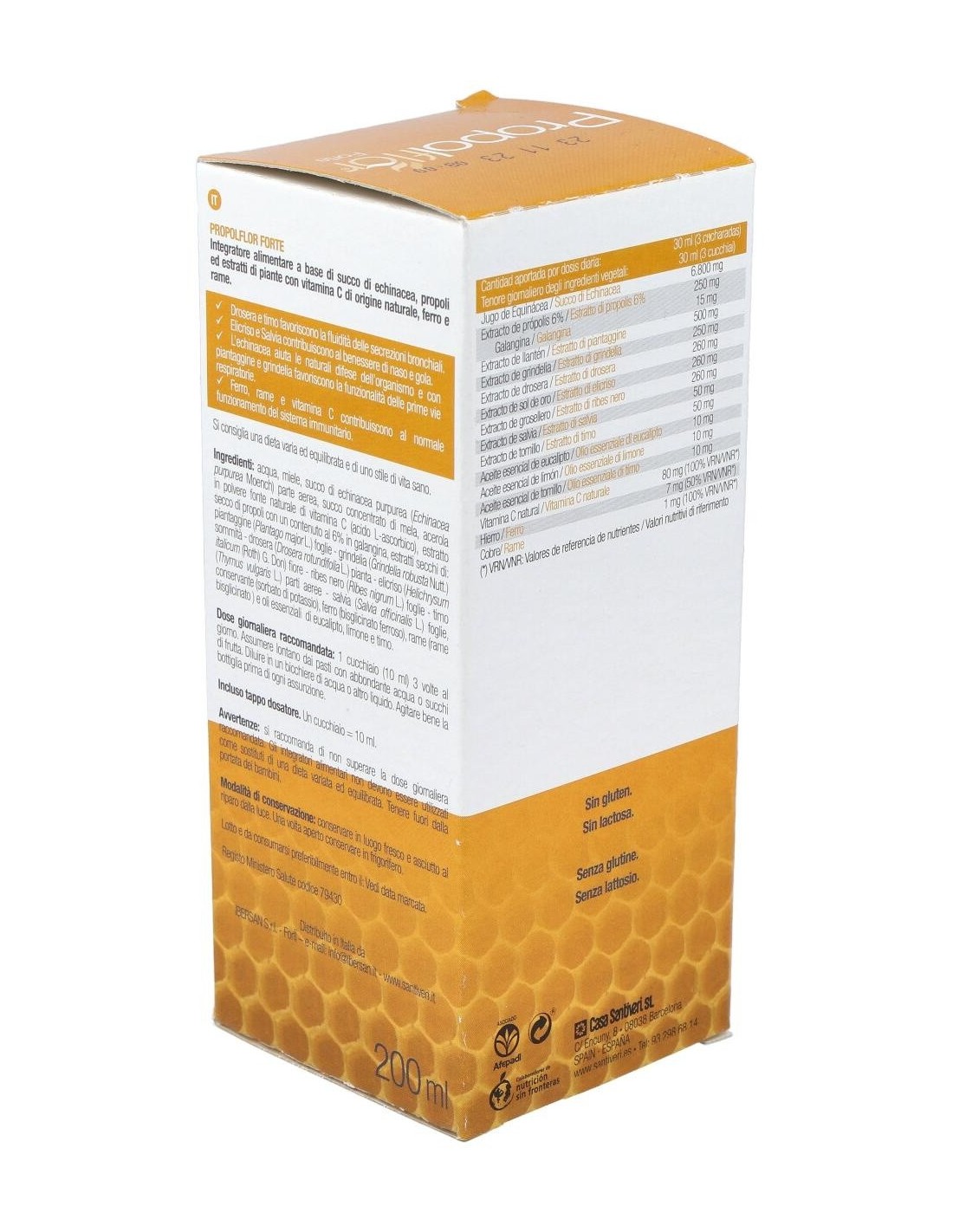 Agua, miel, jugo de equinácea purpúrea (Echinacea purpurea Moench.) parte aérea: zumo concentrado de manzana, acerola en polvo fuente natural de vitamina C (ácido L-ascórbico), extracto seco de própolis con un contenido del 6% en galangina, extractos secos de: llantén (Plantago major L.) hoja - grindelia (Grindelia robusta Nuttal) sumidades - - drosera (Drosera rotundifolia L.) planta - sol de oro (Helichrysum italicum (Roth.) G. Don.) flores - grosellero negro (Ribes nigrum L.) hojas - tomillo (Thymus vulgaris L.) parte aérea - salvia (Salvia officinalis L.) hojas, conservador (sorbato potásico), hierro (gluconato ferroso), cobre (gluconato cúprico) y aceites esenciales de eucalipto, limón y tomillo.