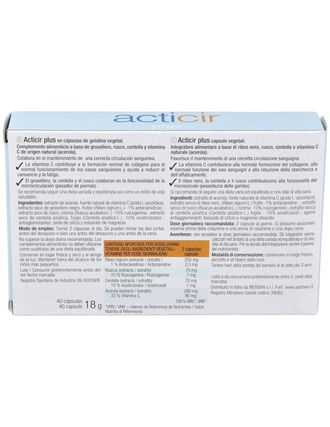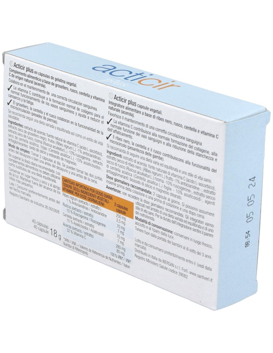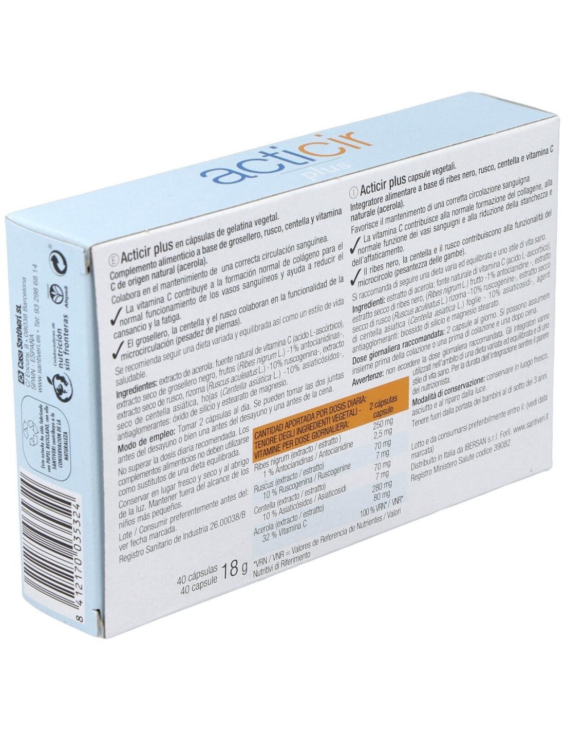 Extracto de acerola: fuente natural de vitamina C (ácido L-ascórbico), extracto seco de grosellero negro, frutos (Ribes nigrum L) -1% antocianidinas, extracto seco de rusco, rizoma (Ruscus aculeatus L) -10% ruscogenina, extracto seco de centella asiática, hojas (Centella asiática L) -10% asiaticósidos-, antiaglomerantes: óxido de silicio y estearato de magnesio.