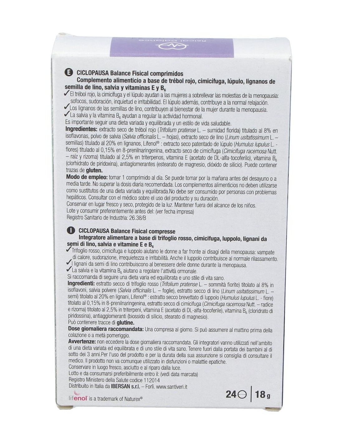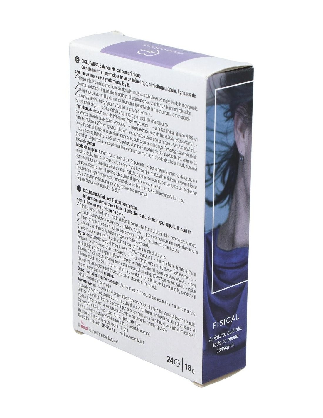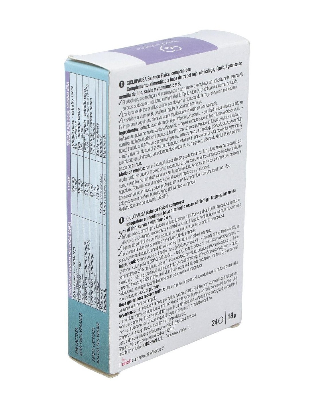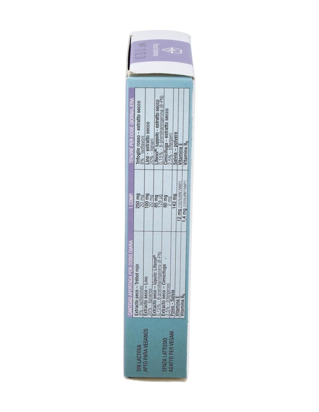 250 mg de extracto seco de trébol rojo, titulado al 8% en isoflavonas (20 mg): 100 mg de extracto seco de lino, titulado al 20% en lignanos (20 mg): 85 mg de extracto seco de lúpulo Lifenol®, titulado al 20% en lignanos (128 µg): 80 mg de extracto seco de cimicífuga, titulado al 2,5% en triterpenos (2 mg): 143 mg de Salvia, polvo: 12 mg de vitamina E: 1,4 mg de vitamina B6