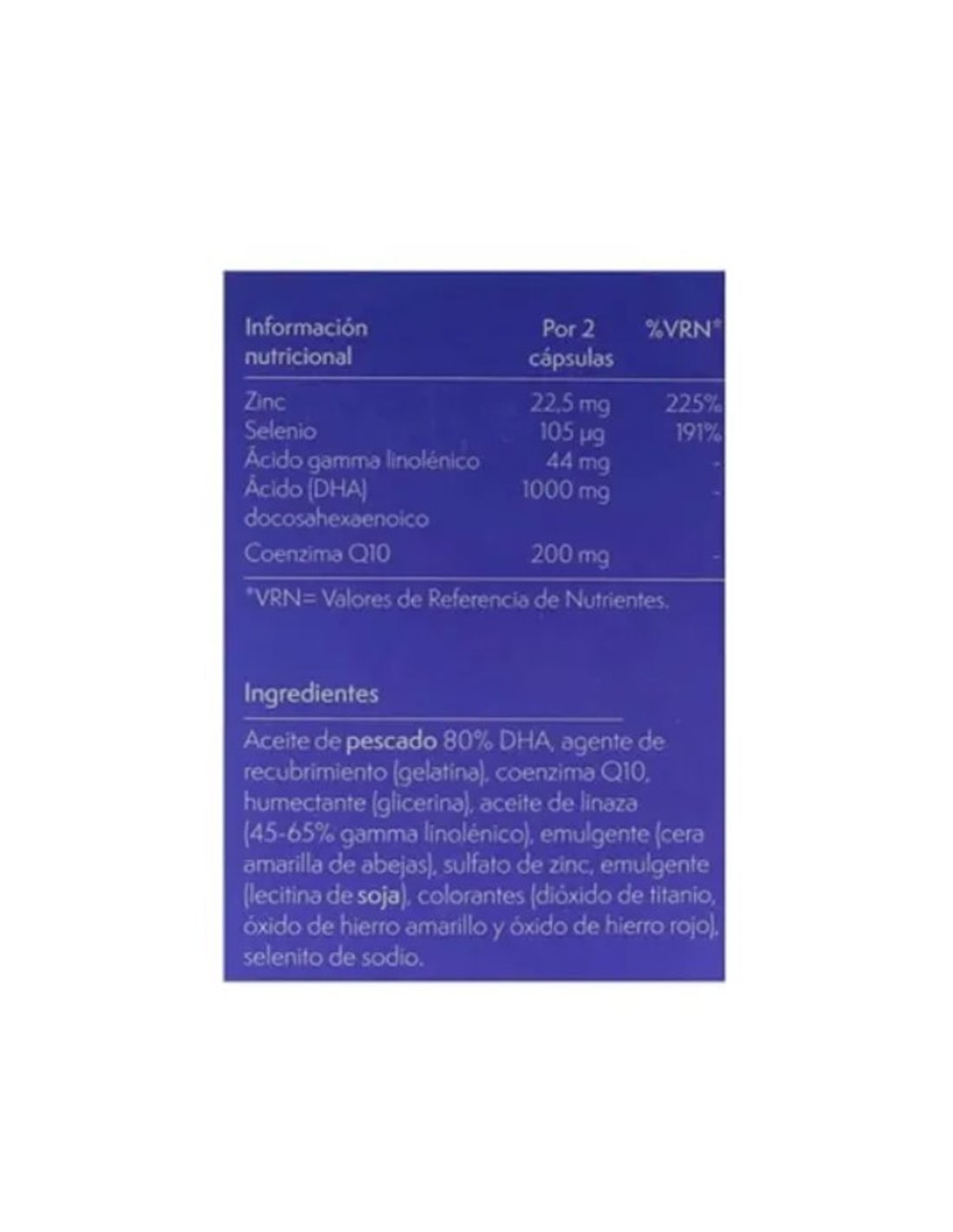 Por 2 cápsulas:\ Ácidos grasos Omega 3\ DHA..1000 mg\ Coenzima 010200 mg\ Zinc.22,5 mg\ Selenio105 µg\ Emulsionantes\ Lecitina de soja y cera de abejas.c.s.p\ \ *Contiene derivados del pescado y soja.