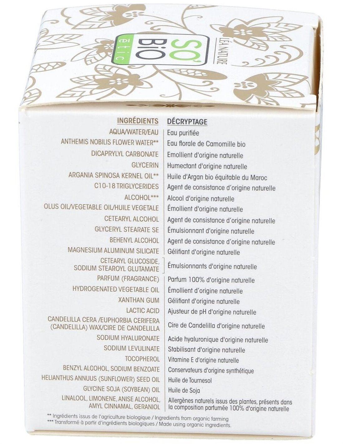 Aqua (Water), Anthemis Nobilis Flower Water*, Coco-Caprylate, Glycerin, Argania Spinosa Kernel Oil*, C10-18 Triglycerides, Alcohol**, Olus Oil (Vegetable Oil), Cetearyl Alcohol, Glyceryl Stearate SE, Benzyl Alcohol, Behenyl Alcohol, Magnesium Aluminum Silicate, Cetearyl Glucoside, Sodium Stearoyl Glutamate, Parfum (Fragrance), Hydrogenated Vegetable Oil, Xanthan Gum, Lactic Acid, Argan Oil Aminopropanediol Esters, Candelilla Cera (Euphorbia Cerifera (Candelilla) Wax), Linalool, Sodium Hyaluronate, Limonene, Sodium Levulinate, Tocopherol, Sodium Benzoate, Helianthus Annuus (Sunflower) Seed Oil, Benzyl Salicylate, Anise Alcohol, Amyl Cinnamal, Geraniol. (*)= Procedentes de cultivo ecológico. 98% del total de los Ingredientes es de origen natural. 20% del total de los Ingredientes es de cultivo ecológico.