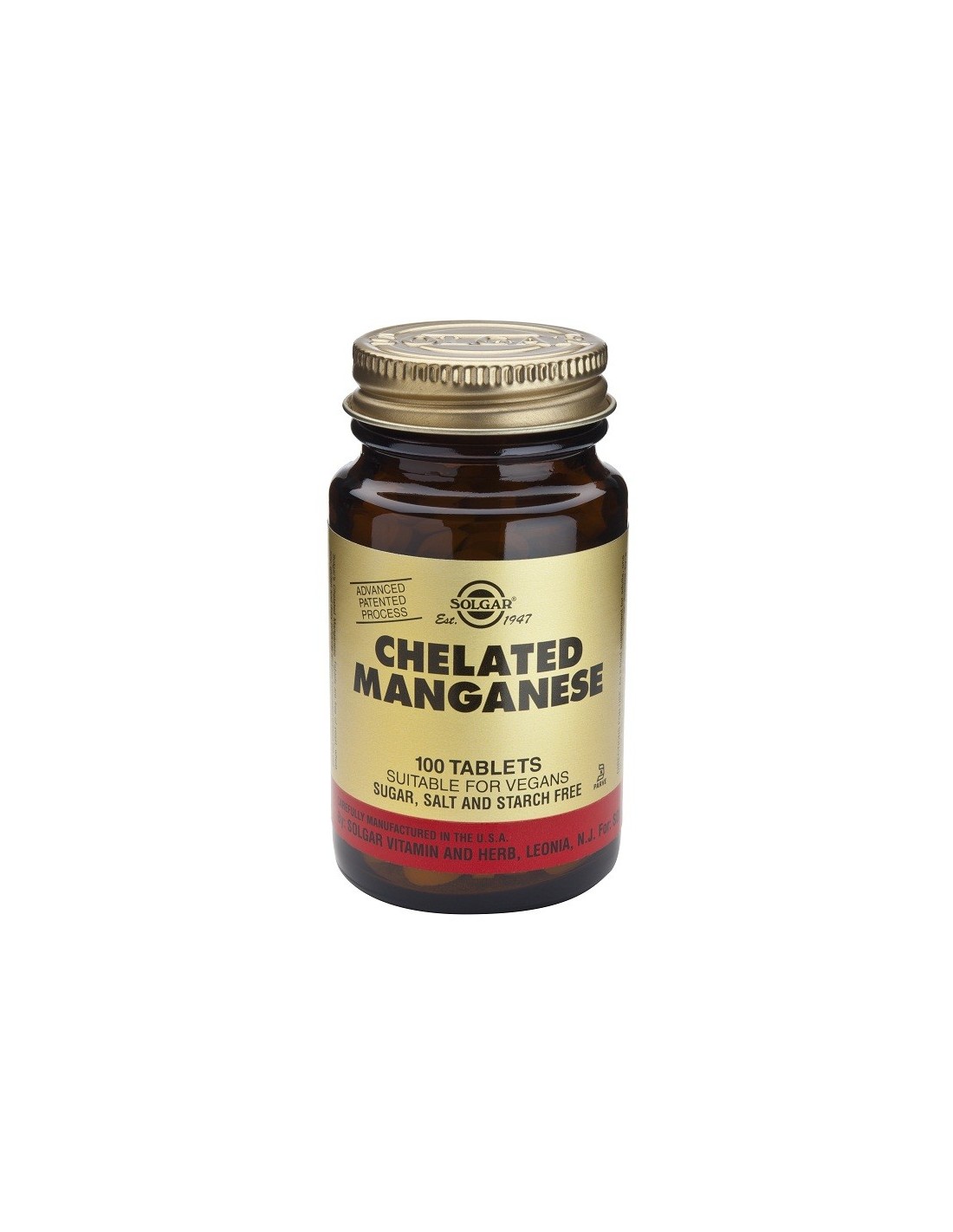 El Manganeso Quelado 100Comp de Solgar es un suplemento mineral para personas que buscan apoyar el metabolismo y la salud ósea, formulado con manganeso en forma quelada para una mejor absorción.