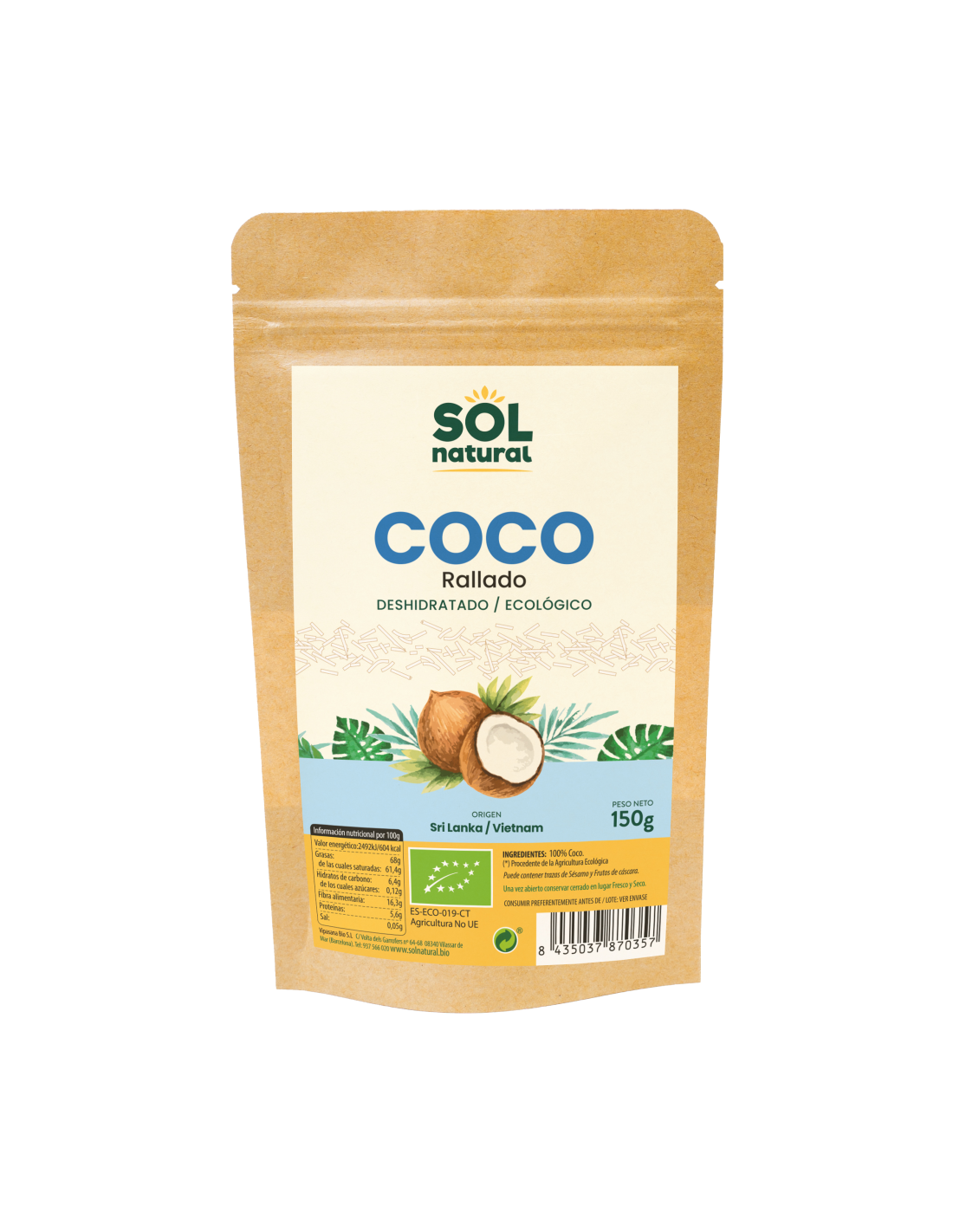 SOLNATURALCaracterísticas y Beneficios del Pack 12 Uds. Coco Rallado Bio 150 g de Solnatural