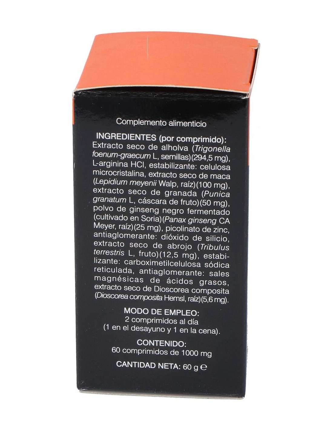 Comprimidos elaborados a base de alholva, maca, granada y ginseng negro fermentado de Soria que combinados ayudan a evitar los efectos de la reducción de testosterona provocados por el paso del tiempo, como problemas cardiovasculares o metabólicos o trastornos como alteraciones del sueño o disfunción sexual.Modo de empleoTomar 2 comprimidos al día, uno en el desayuno y otro en la cena.