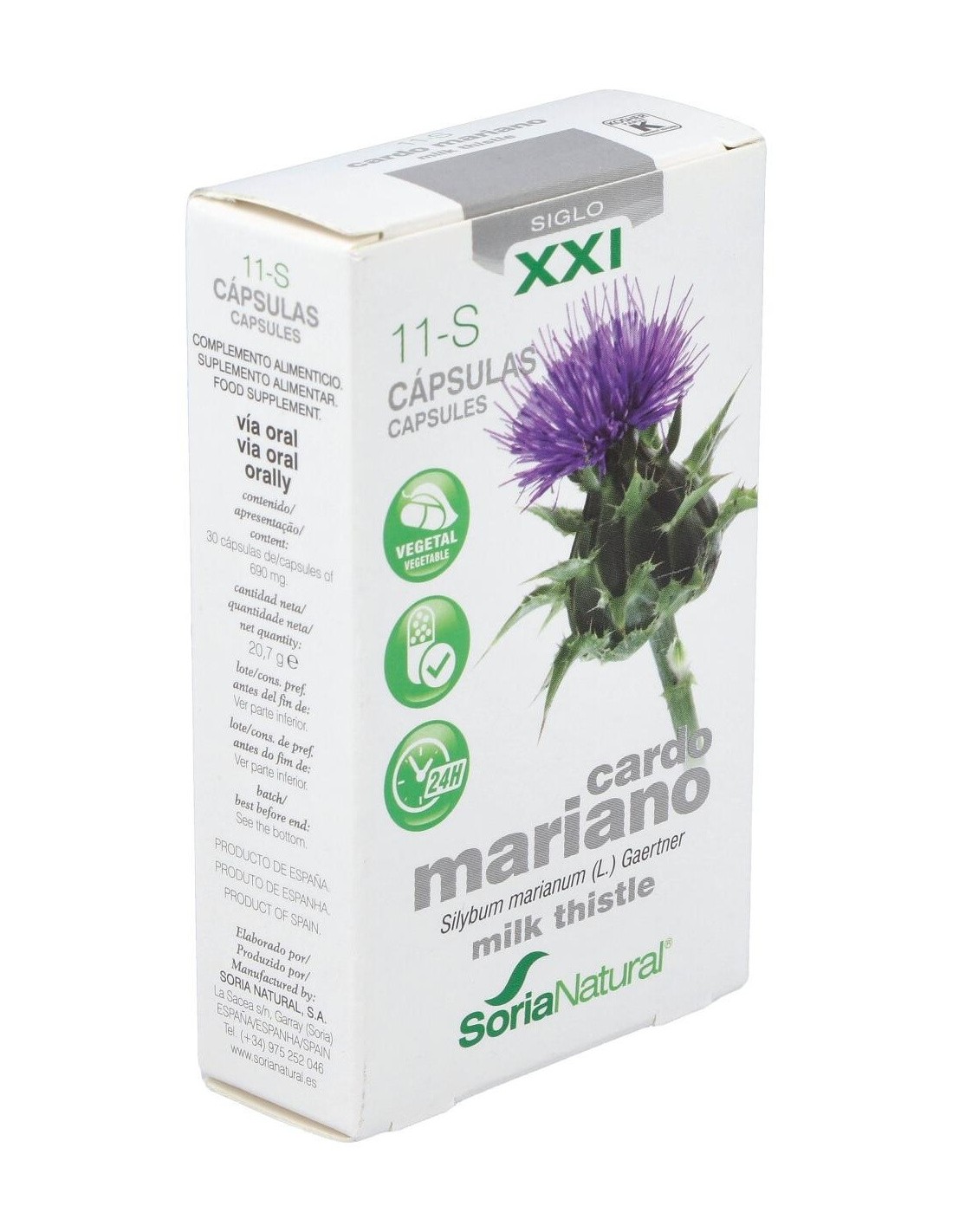 El Cap.S-11 Cardo Mariano Xxi 30Cap. de Soria Natural es un suplemento natural para personas que buscan apoyar la salud hepática, formulado con extracto de cardo mariano que contribuye a la función del hígado.