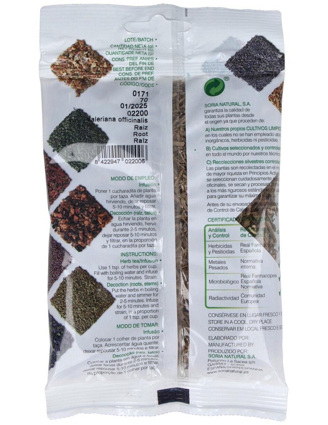 La valeriana incluida en esta bolsa proviene de cultivos controlados, garantizando un producto con características constantes. Su formato en bolsa permite conservar las propiedades del contenido, manteniendo su frescura y calidad durante más tiempo.