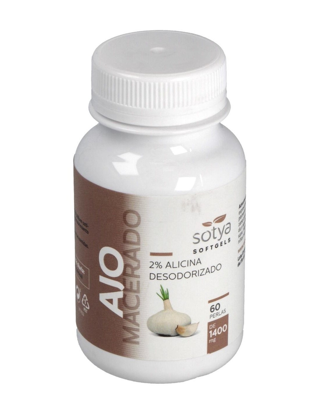 El Ajo Macerado 1400Mg Perlas 60U de Sotya es un suplemento natural para adultos que aporta 1400 mg de ajo macerado por dosis, contribuyendo al bienestar general mediante una fórmula en perlas de fácil consumo.