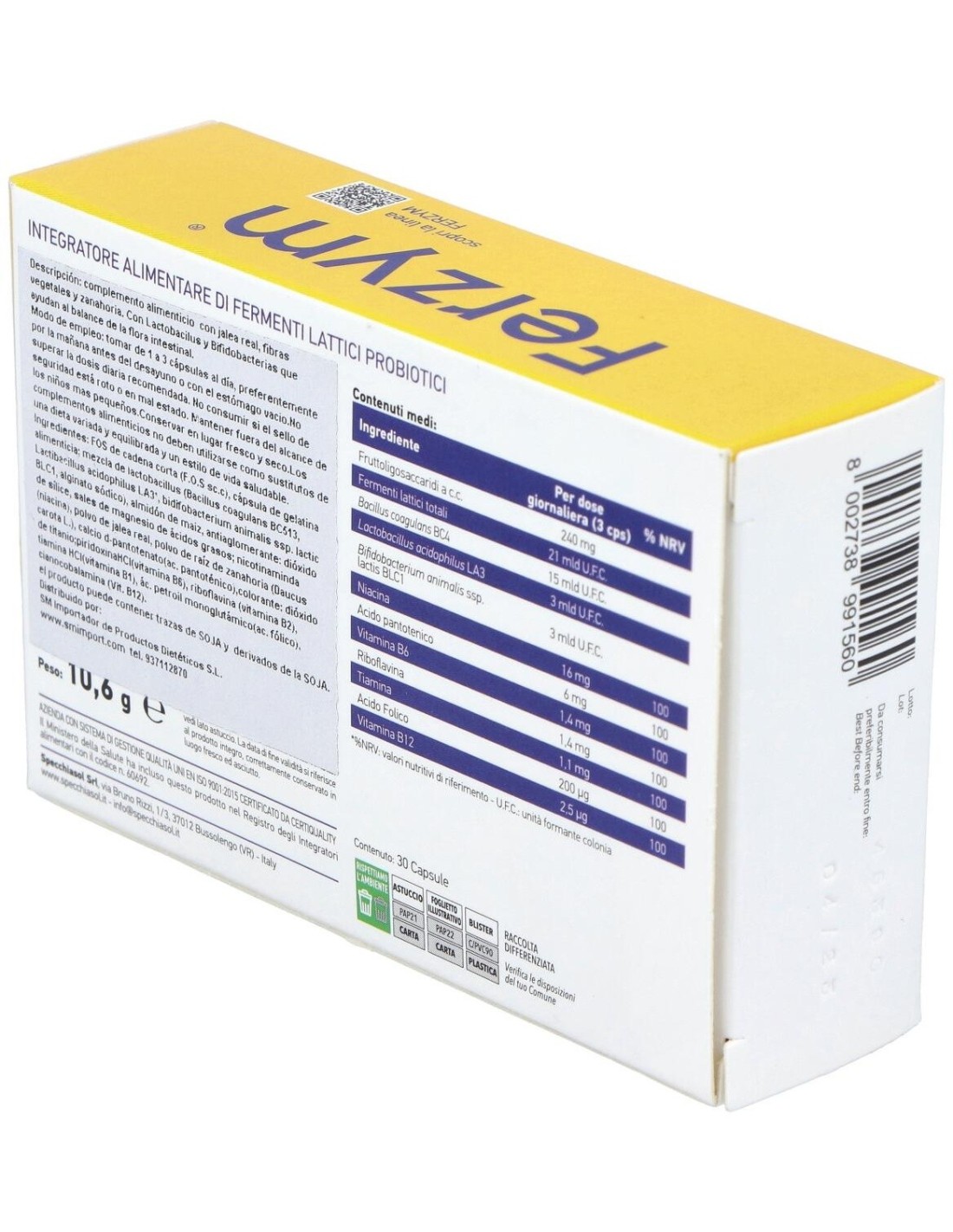 Frutooligosacáridos de cadena corta (F.O.S.c.c), cápsula de gelatina alimenticia:almidón de maíz: mezcla de fermentos lácticos (Bacillus coagulans snz 1969 (DSM BCCM/LMG S-27484) Lactobacillus acidophilus LA3(/DSM 17742), Bifidobacterium animalis ssp. lactis BLC1 (DSM 17741): antiaglomerantes: dióxido de sílicio, sales de magnesio de ácidos grasos: nicotimanima (niacina): calcio D pantotenato (ácido pantoténico): clorhidrato de piridoxina (vitamina B6), riboflaniva (vitamina B2) clorhidrato de tiamina (vitamina B1), alginato de sodio, ácido pteroil monoglutámico (ácido fólico), cianocobalamina (Vitamina B12).