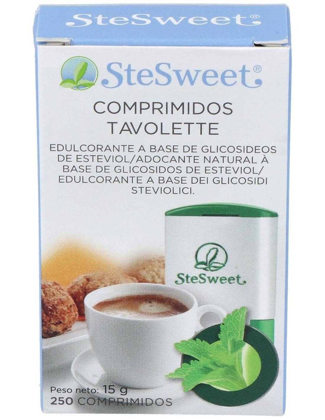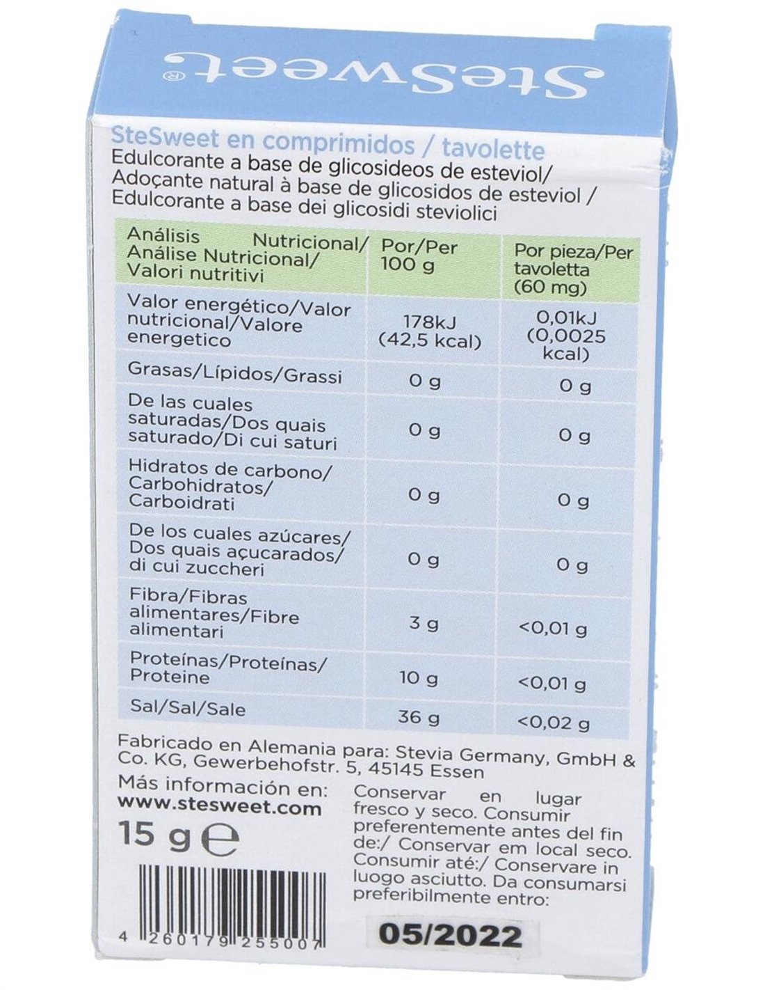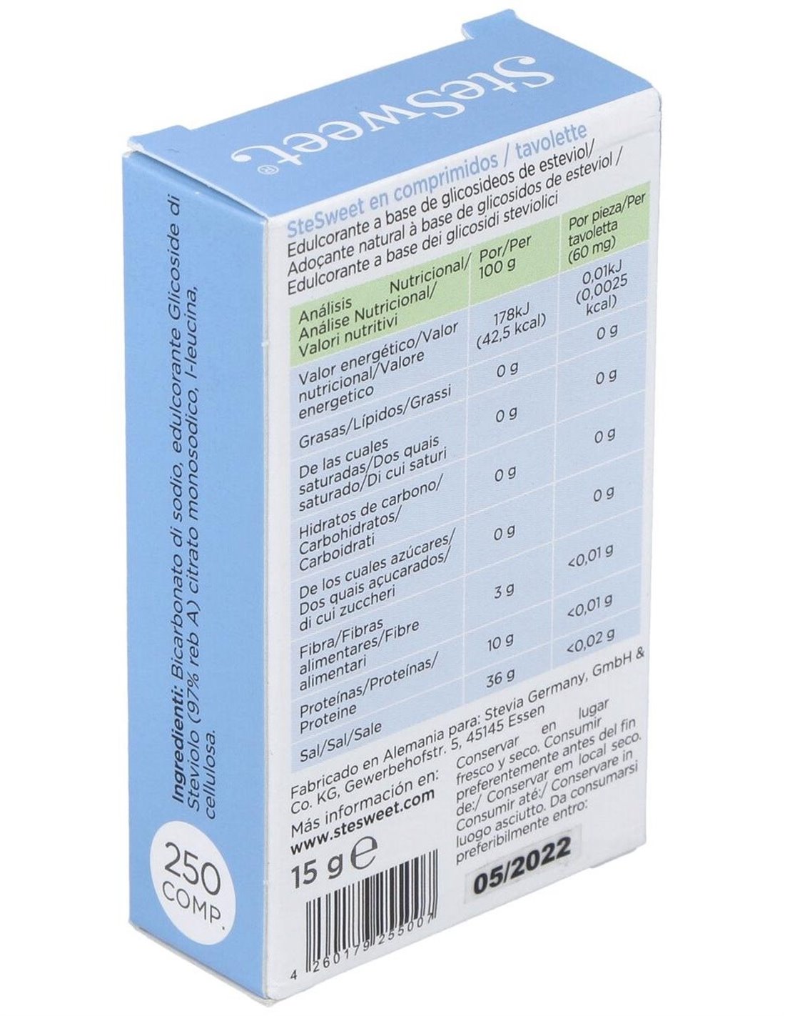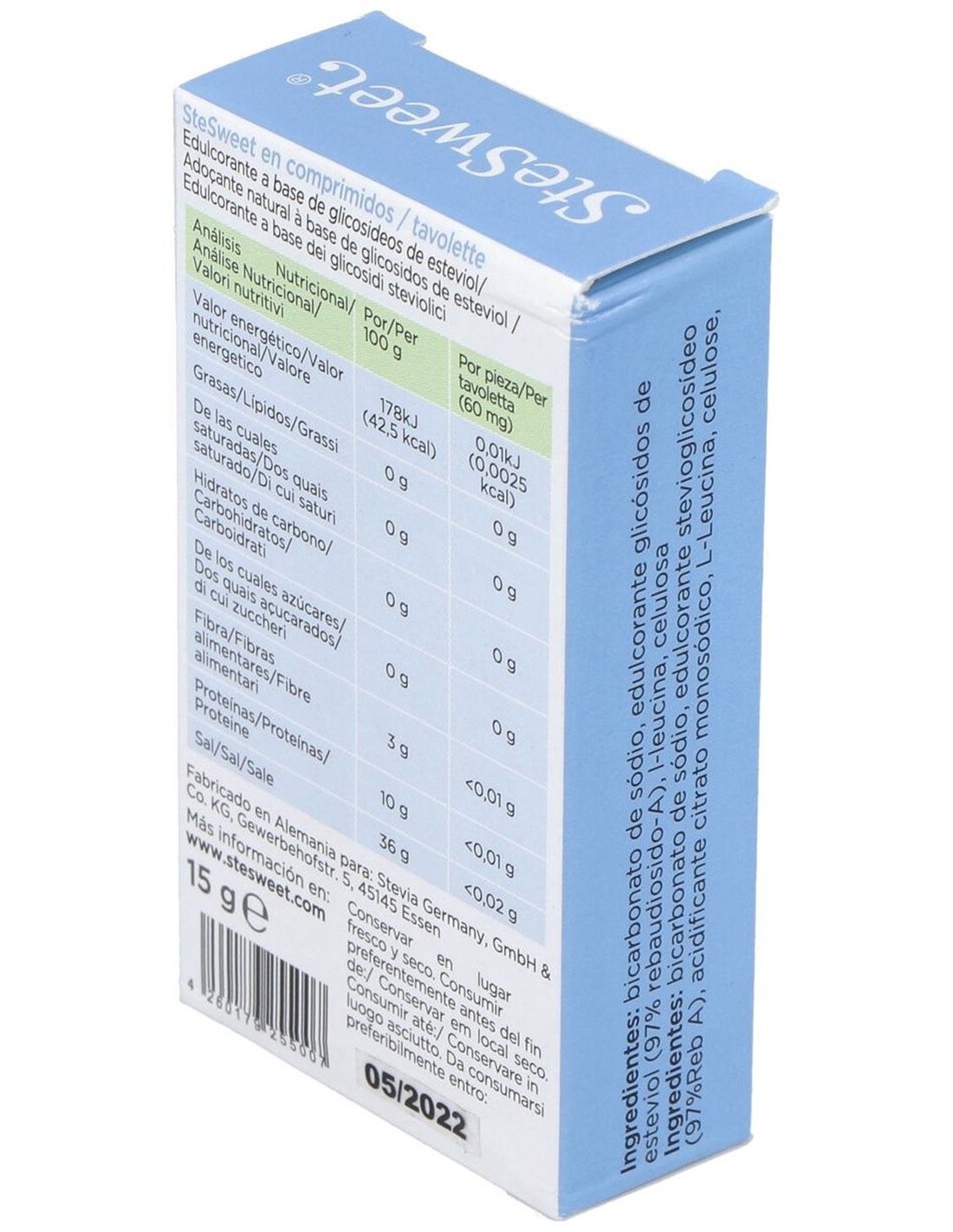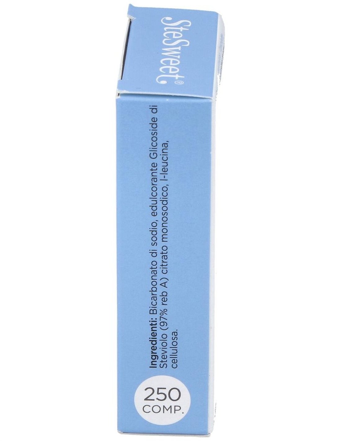 Bicarbonato de sodio, esteviolglicósidos (97% Reb A), citrato monosódico, celulosa, ácido cítrico, L-leucina, estearato de magnesio.