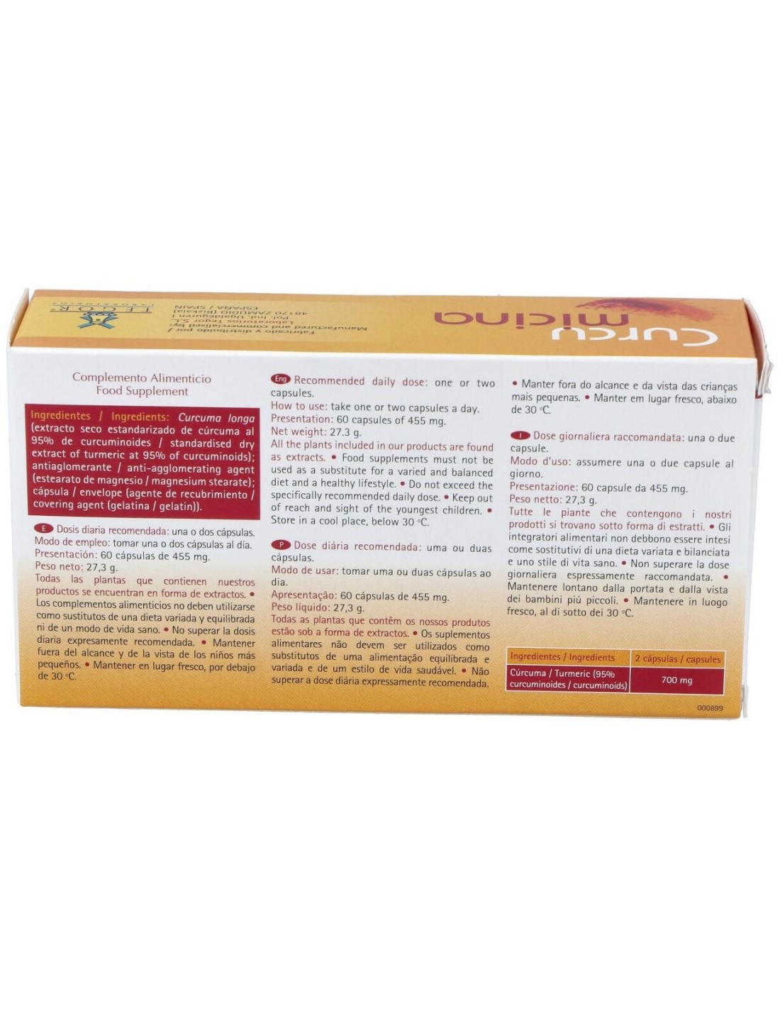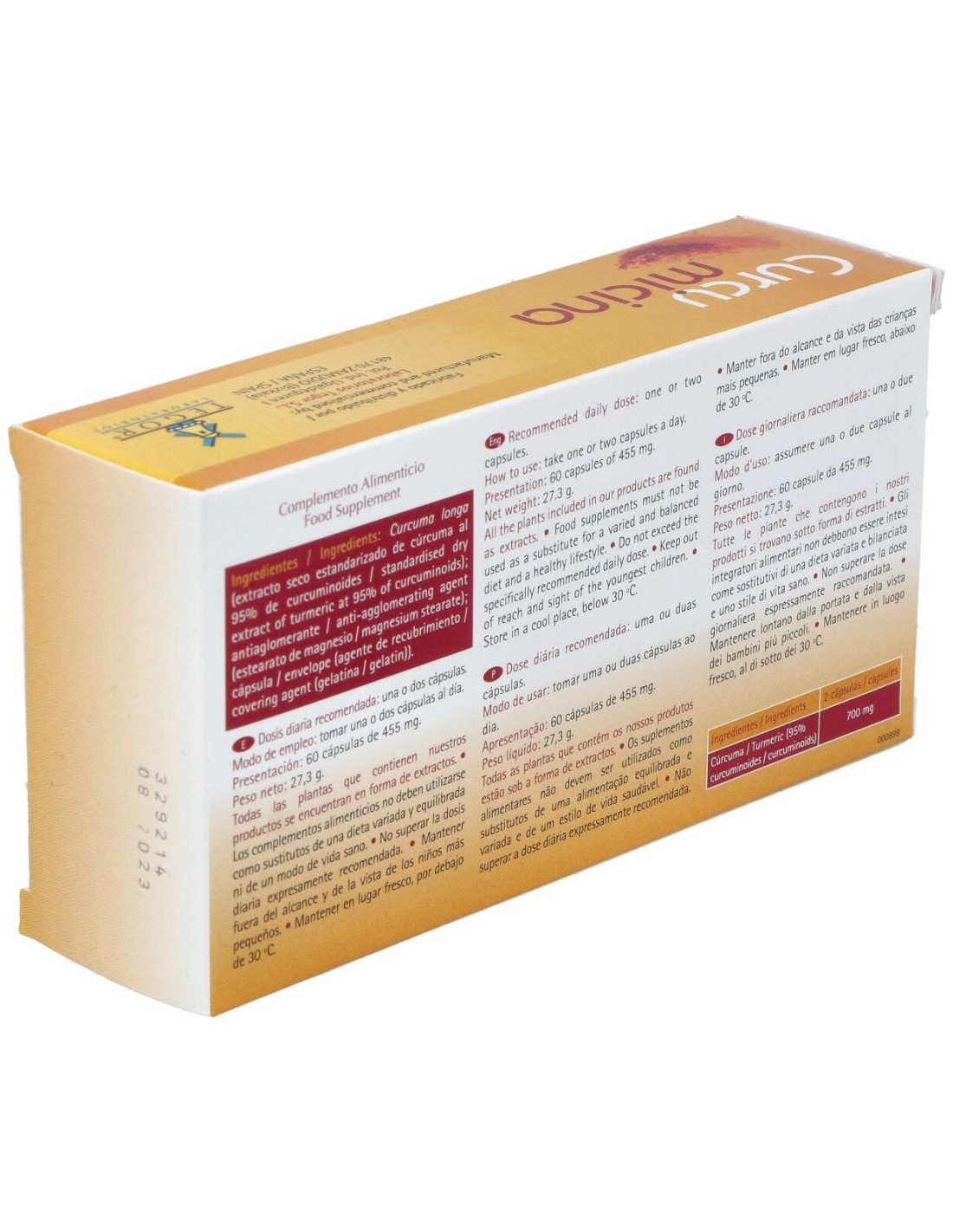 El producto está elaborado con ingredientes seleccionados para asegurar la calidad y estabilidad del extracto de curcumina. Su formato en cápsulas permite una dosificación precisa y una mejor conservación del contenido activo. Es ideal para quienes prefieren un suplemento en formato sólido que se integra fácilmente en cualquier rutina.