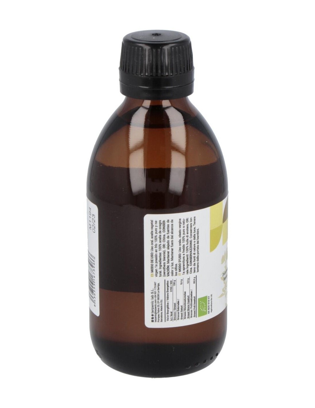 - Aceite 100% virgen y ecológico, obtenido mediante prensado en frío para conservar sus propiedades naturales.