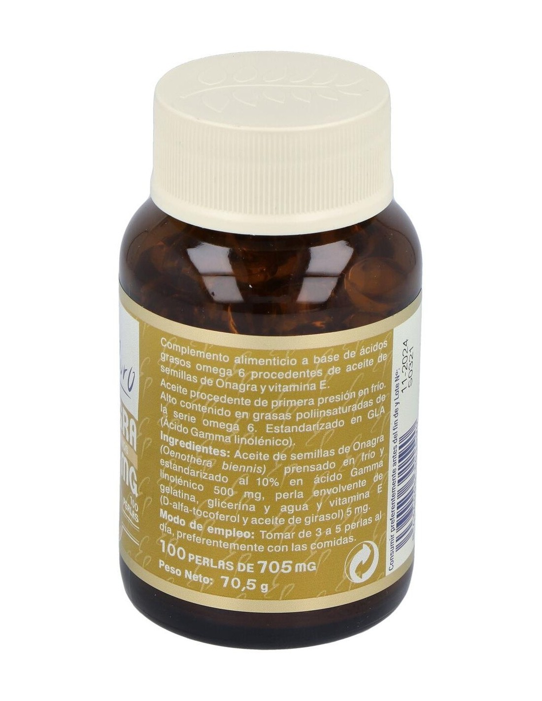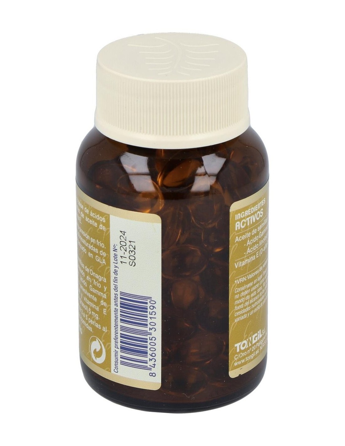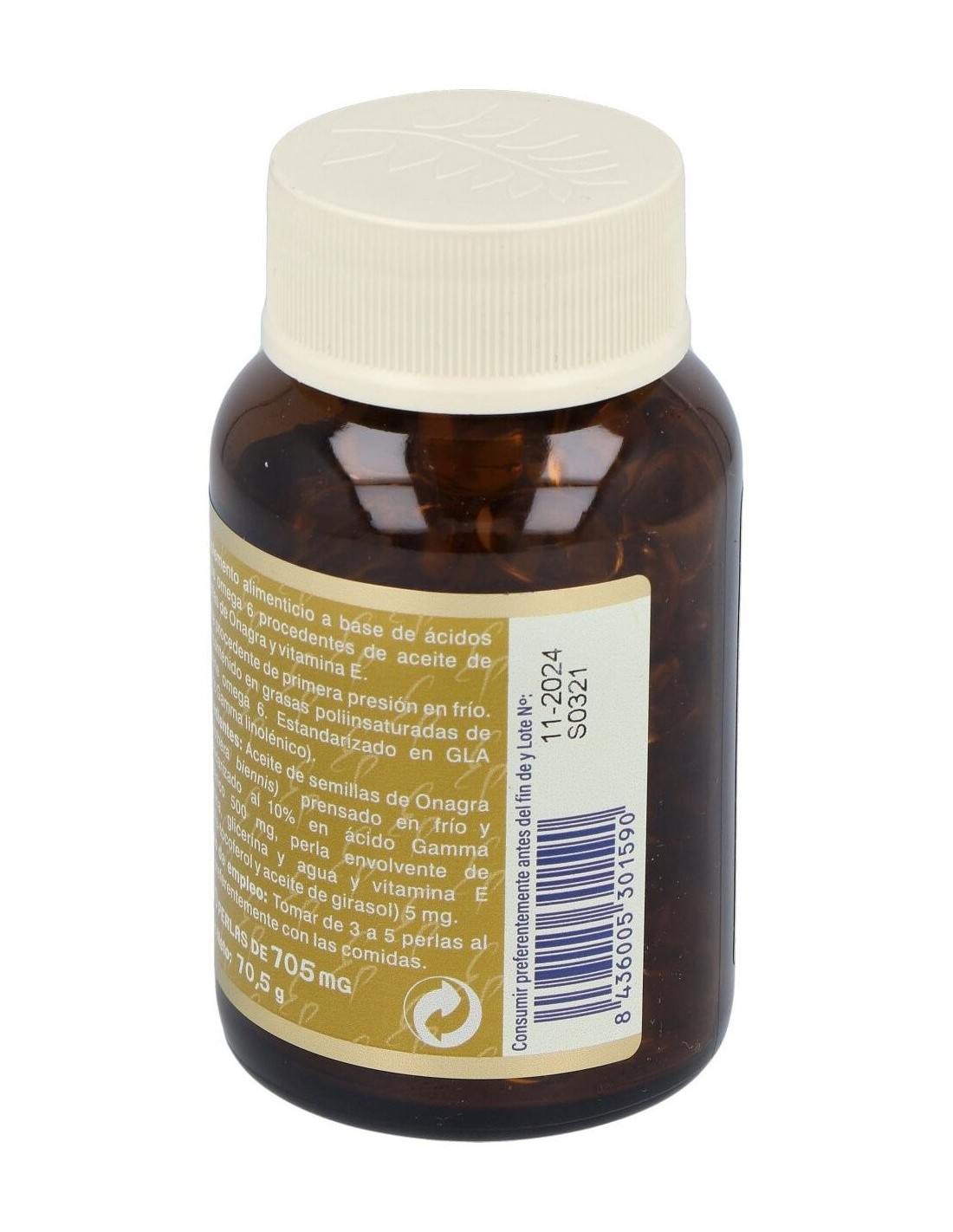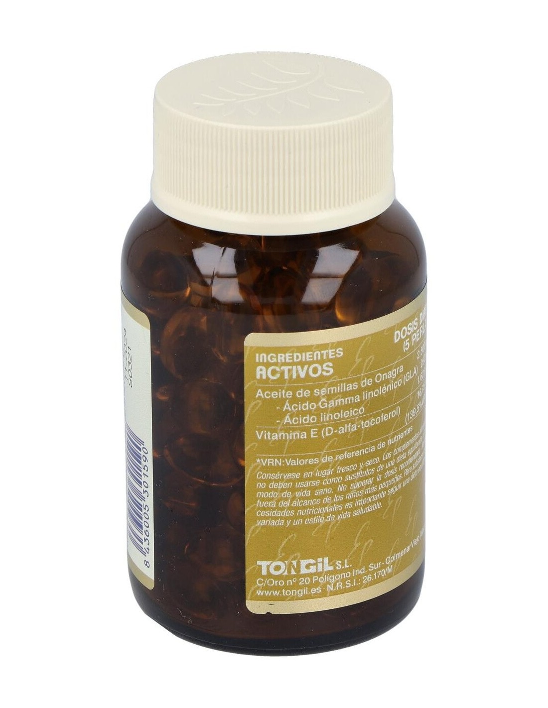 Aceite de semillas de Onagra (Oenothera biennis) procedente de primera presión en frío con un alto contenido en grasas poliinsaturadas de la serie omega 6, concretamente aporta un 10% de GLA (Ácido Gamma linolénico) y 65% en Ácido linoleico. La fórmula se acompaña de vitamina E en forma de alfa-tocoferol.
