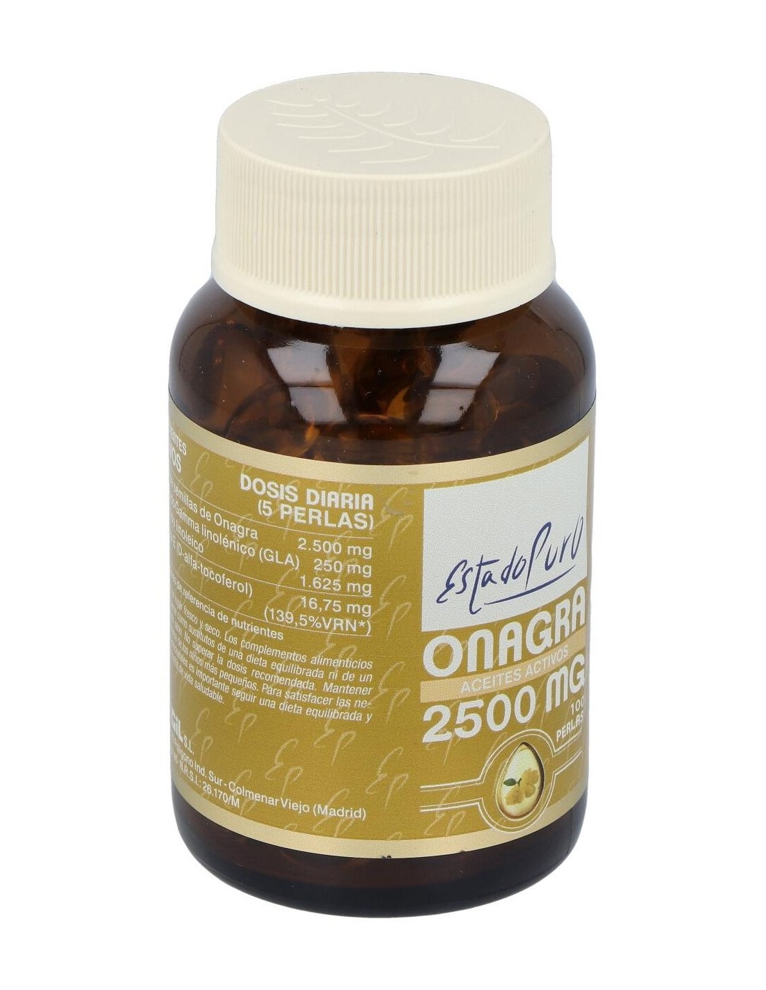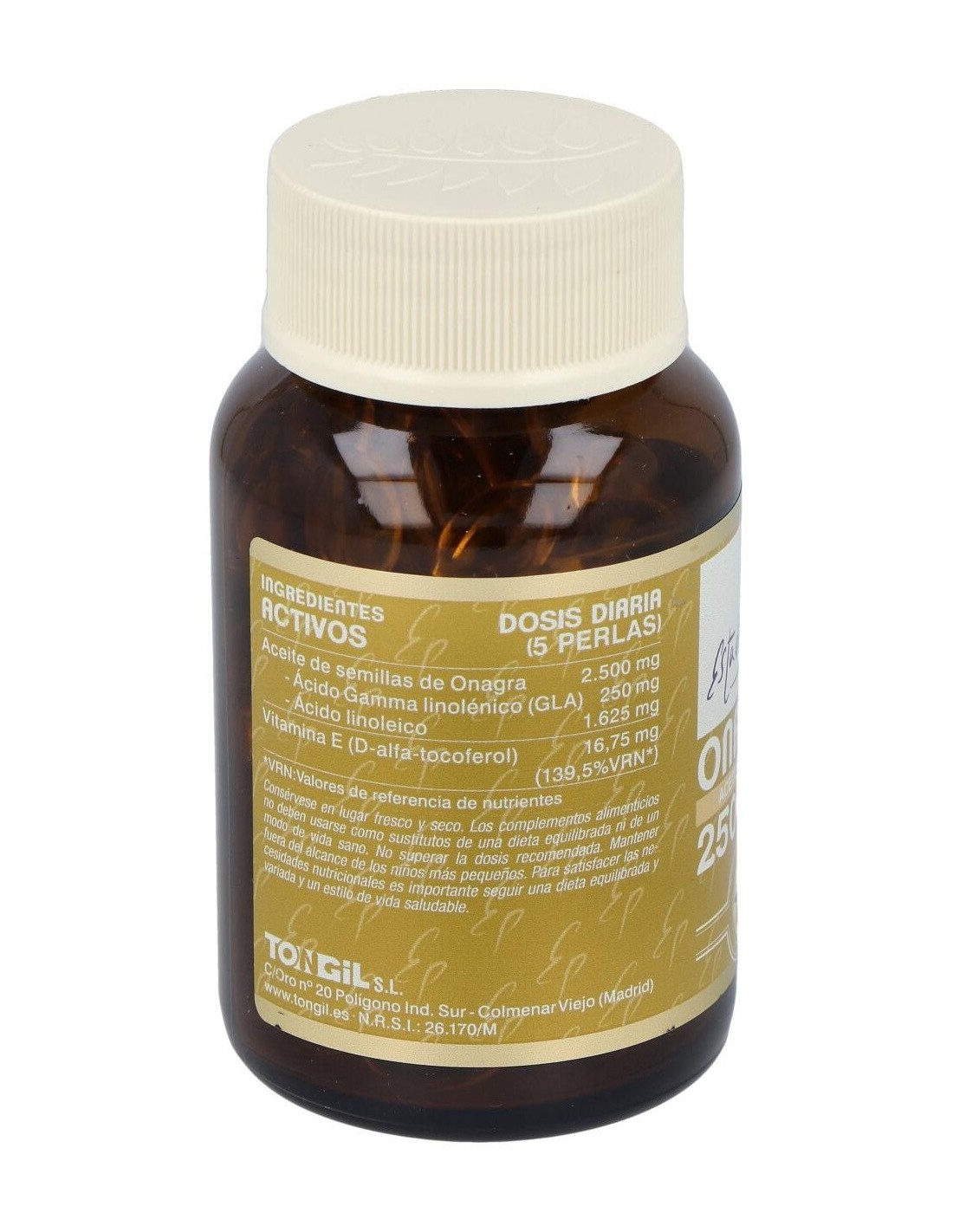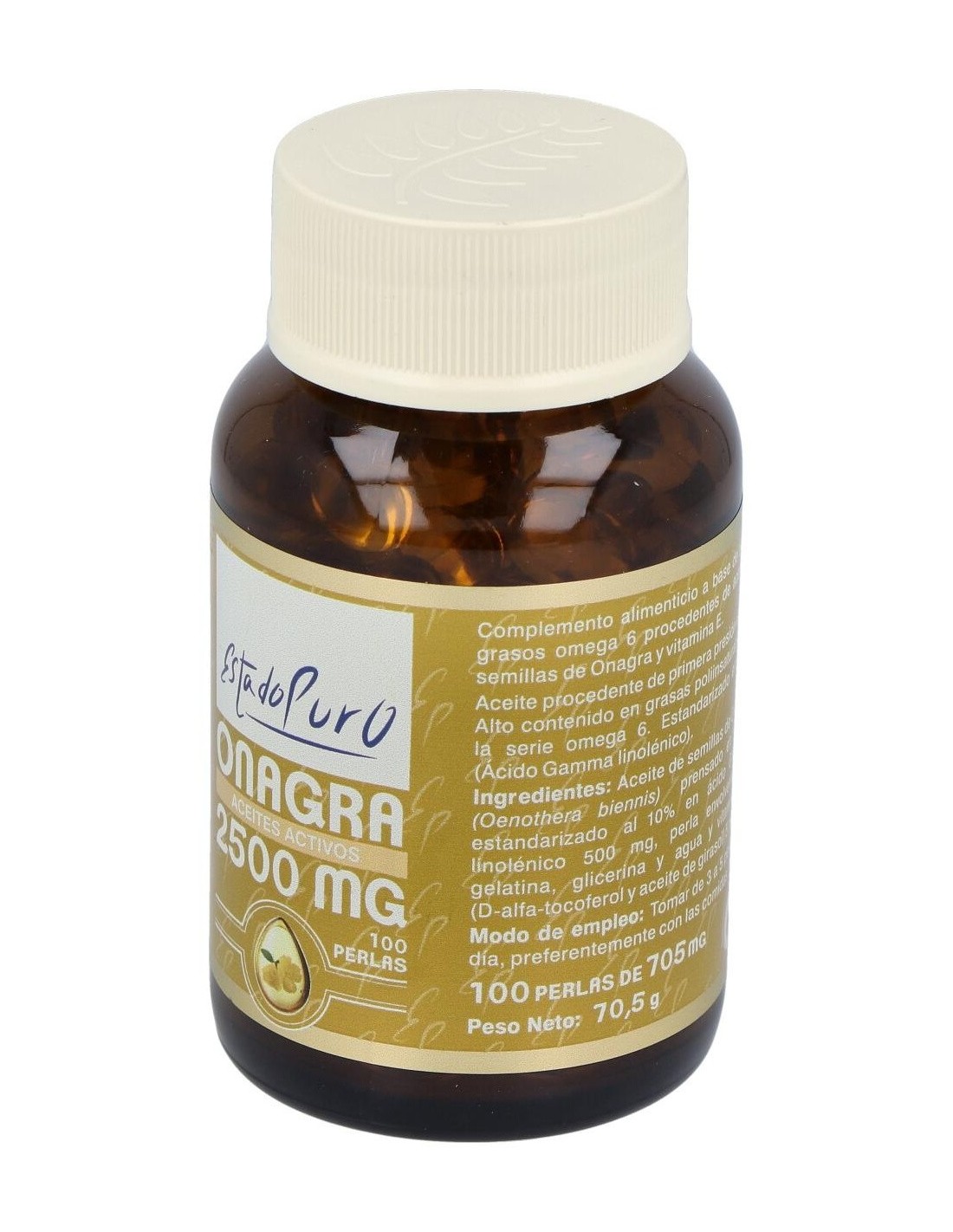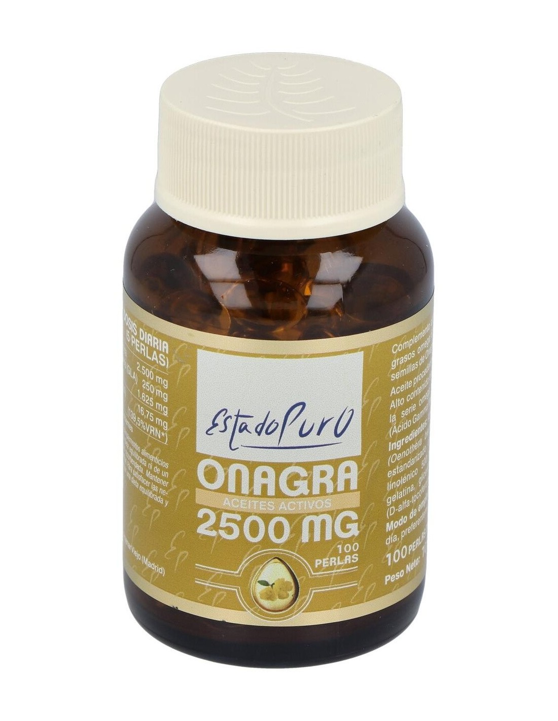 Aceite de semillas de Onagra (Oenothera biennis) procedente de primera presión en frío con un alto contenido en grasas poliinsaturadas de la serie omega 6, concretamente aporta un 10% de GLA (Ácido Gamma linolénico) y 65% en Ácido linoleico. La fórmula se acompaña de vitamina E en forma de alfa-tocoferol.