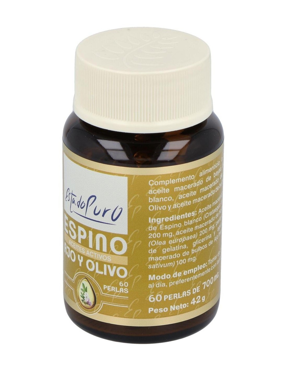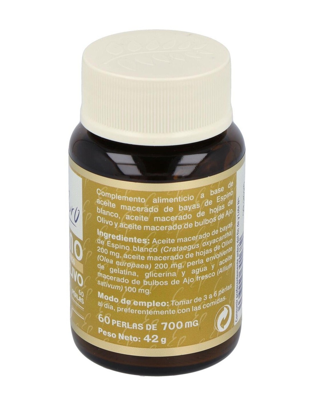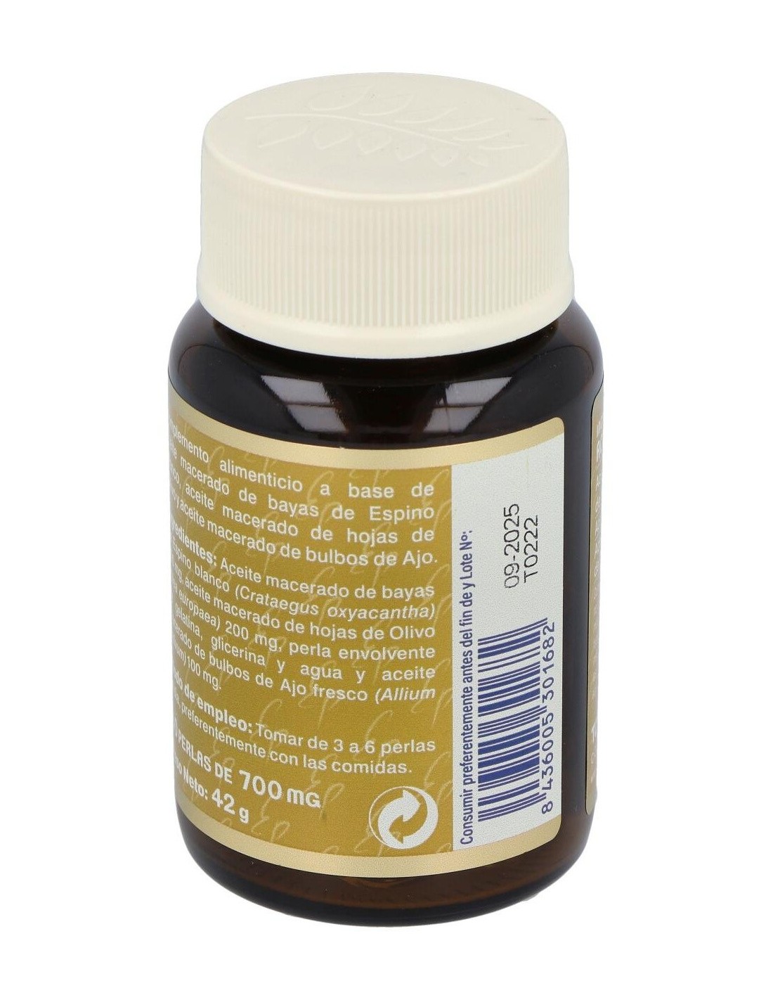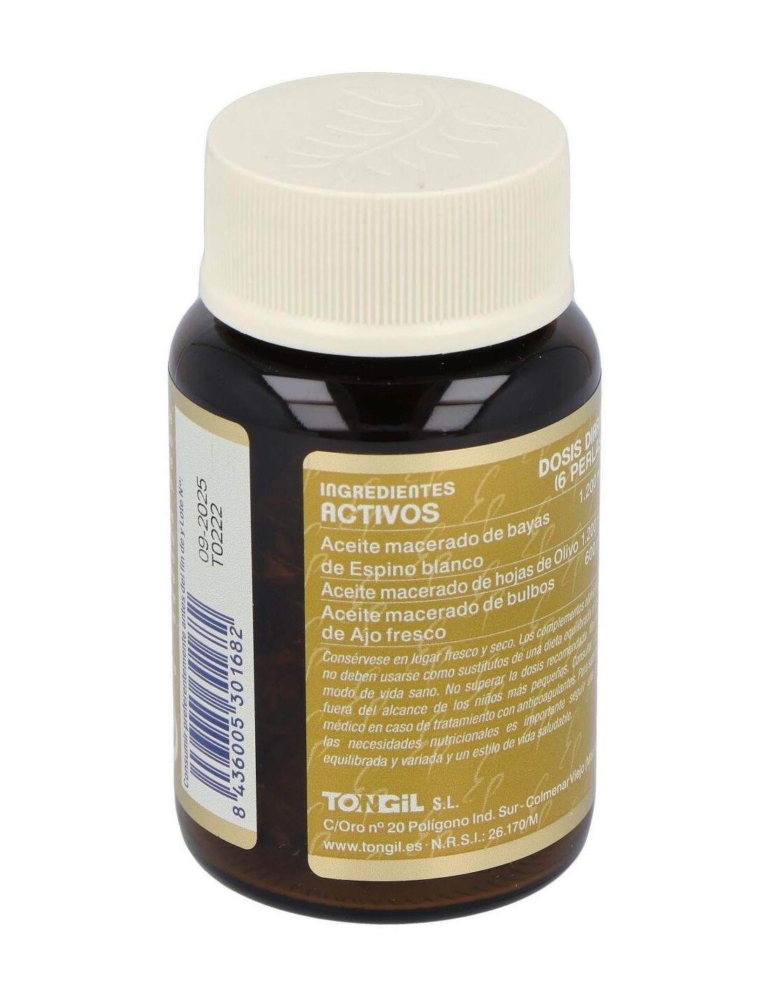 Complemento alimenticio a base de aceite macerado de bayas de Espino blanco, aceite macerado de hojas de Olivo y aceite macerado de bulbos de Ajo.