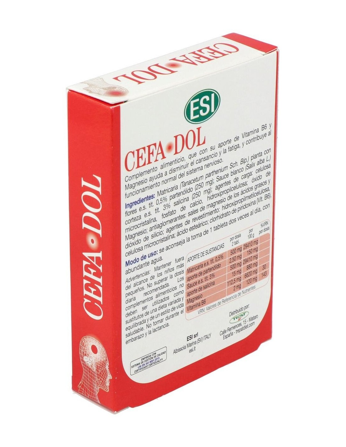 Cefadol de ESI es un complemento alimenticio útil para favorecer la relajación de forma natural y disminuir la tensión muscular. Indicado en aquellas personas que sufren migrañas, jaquecas y dolor de cabeza crónico. El magnesio también puede resultar útil para la transmisión de los estímulos nerviosos. Ingredientes por cápsula: