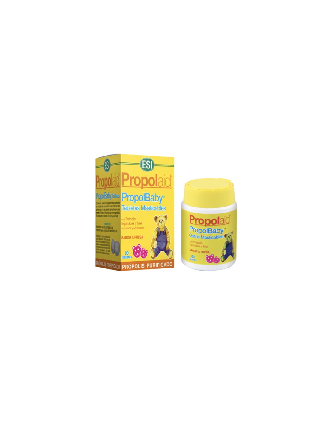 Producto con forma de osito muy útil par aaumentar las defensas naturales inmunológicas de los niños, en particular contra las enfermedades de enfriamiento en la estación invernal. Por tanto, resulta particularmente válida la asociación sinñergica del própolis y la equinácea. El própolis presenta propiedades inmunoestimulantes, antiinflamatorias, antihemorrágicas, anestésicas, cicatrizantes, antibióticas y fungicidas. La equinácea purpurea potencia de forma natural las defensas inmunitarias y es muy útil como coadyuvante en el tratamiento de las vías altas. La miel enriquece el producto de sustancias benéficas y naturales. La leche descremada en polvo, fuente natural de proteínas, representa la base ideal para tabletas masticables para niños. Propiedades de sus principios activos: