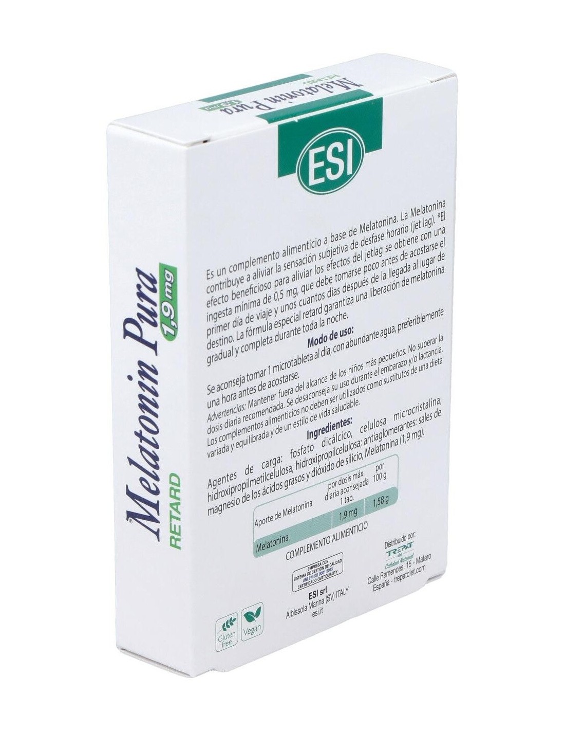 Producto que por su composición es útil para favorecer un descanso fisiológico. Indicado para quien tiene dificultad para conciliar el sueño y mantenerlo durante toda la noche y para quien desea regular el ritmo de sueño-vigilia. Por ello resulta muy útil en la regulación de los ritmos circadianos y para favorecer la adaptación del organismo (jet lag). La fórmula especial retard garantiza una liberación de melatonina gradual y completa durante toda la noche.La Melatonina (N-acetil-5-metoxitriptamina) es una hormona producida por la epi´fisis o gla´ndula pineal, que se libera en las horas nocturnas. La produccio´n de la hormona es ma´xima en la primera infancia, se ralentiza despue´s de los 20 an~os y empieza a decrecer a partir de los 45 an~os, desapareciendo casi completamente en la tercera edad.Su secrecio´n sigue un ritmo circadiano: se inicia al anochecer, llegando a su punto culminante durante la noche, decrece al mi´nimo por la man~ana y permanece muy baja durante todo el di´a. En condiciones de oscuridad, cuando las ce´lulas nerviosas de la retina no esta´n estimuladas por la luz, el hipota´lamo estimula la epi´fisis para que produzca Melatonina.La Melatonina reduce los radicales libres mejor que otros antioxidantes. Tiene un doble poder respecto a la Vitamina E y cinco veces superior al glutatio´n, al ser soluble tanto en agua como en grasas (hidro y liposoluble).Composición activa por comprimido:1,9 mg de melatonina.Otros ingredientes:Agentes de carga, calcio fosfato, celulosa microcristalina; hidroxipropilmetilcelulosa; hidroxipropilcelulosa, agentes antiaglomerantes: estearato vegetal de magnesio y dióxido de silicio. Modo de empleo:Tomar 1 comprimidos entre 30 y 40 minutos antes de dormir.Presentación:Envase de 60 comprimidos retard.Recomendaciones y advertencias:No contiene gluten, derivados la´cteos, lactosa, azu´car an~adido y conservantes an~adidos, colorantes artificiales, aromas artificiales, OGM. Apto para vegetarianos y veganos.