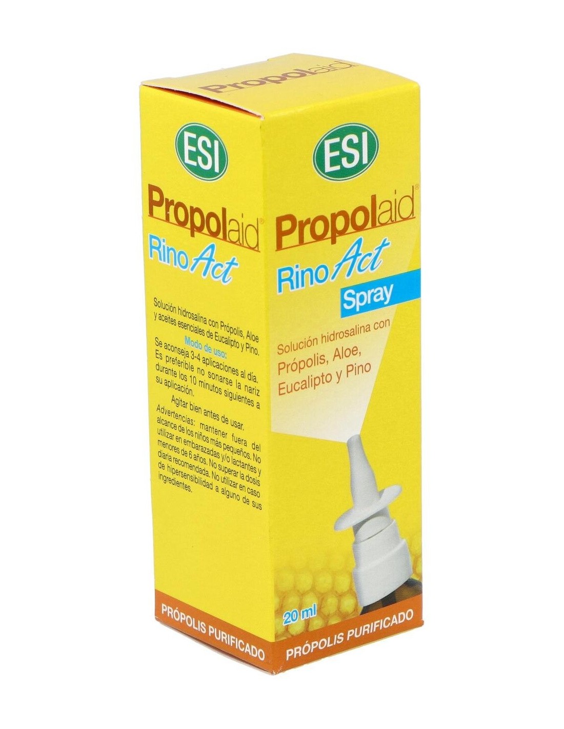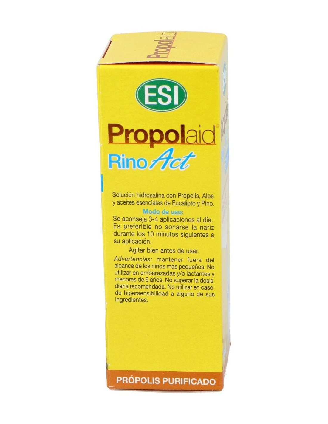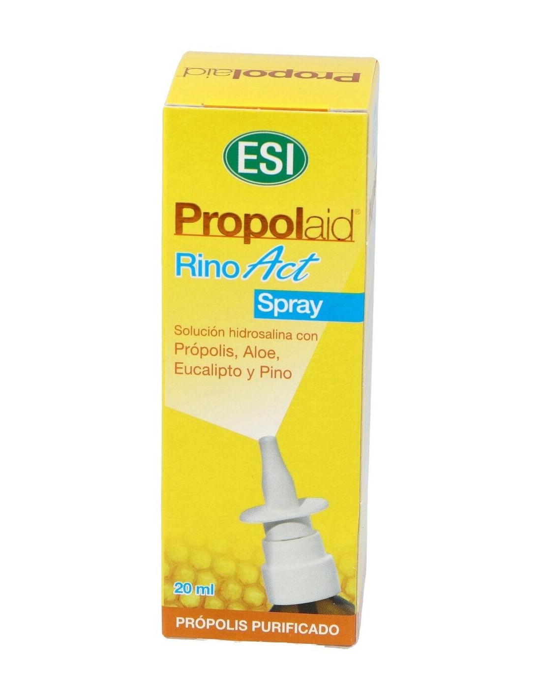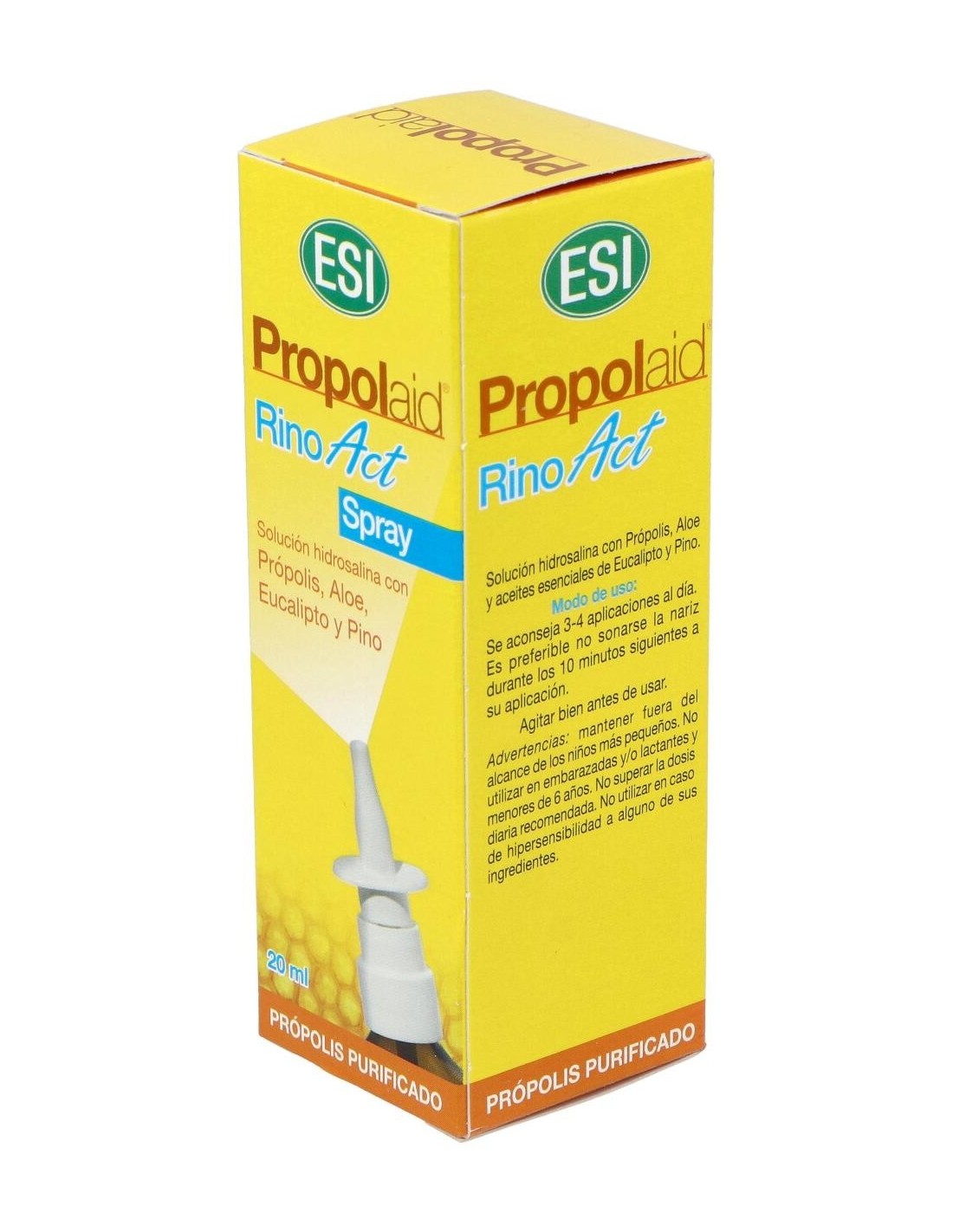 Propolaid Rino Act de ESI es un spray nasal diseñado especialmente para adultos y niños a partir de 6 años. Rino Act es un spray de solución salina con própolis, aloe vera, eucalipto y pino. Es un descongestivo nasal indicado en procesos que cursan con secreción: sinusitis, rinitis, resfriado... Rino Act limpia y descongestiona las fosas nasales respetando el líquido orgánico, promueve una buena higiene nasal y ayuda con la sequedad. Vaporizador sin gas.Propiedades de los principios activos: