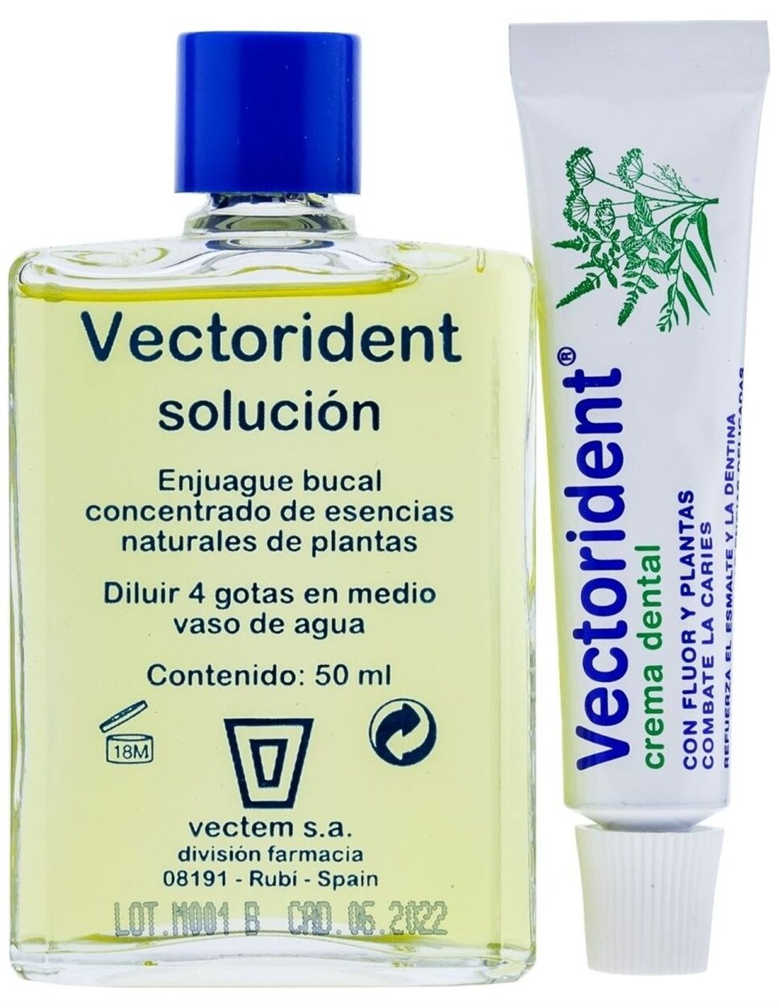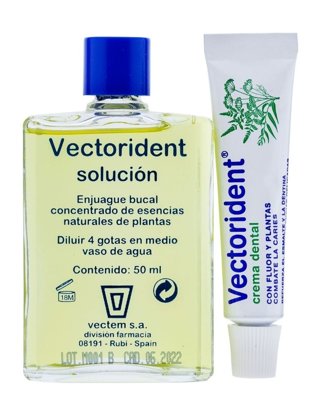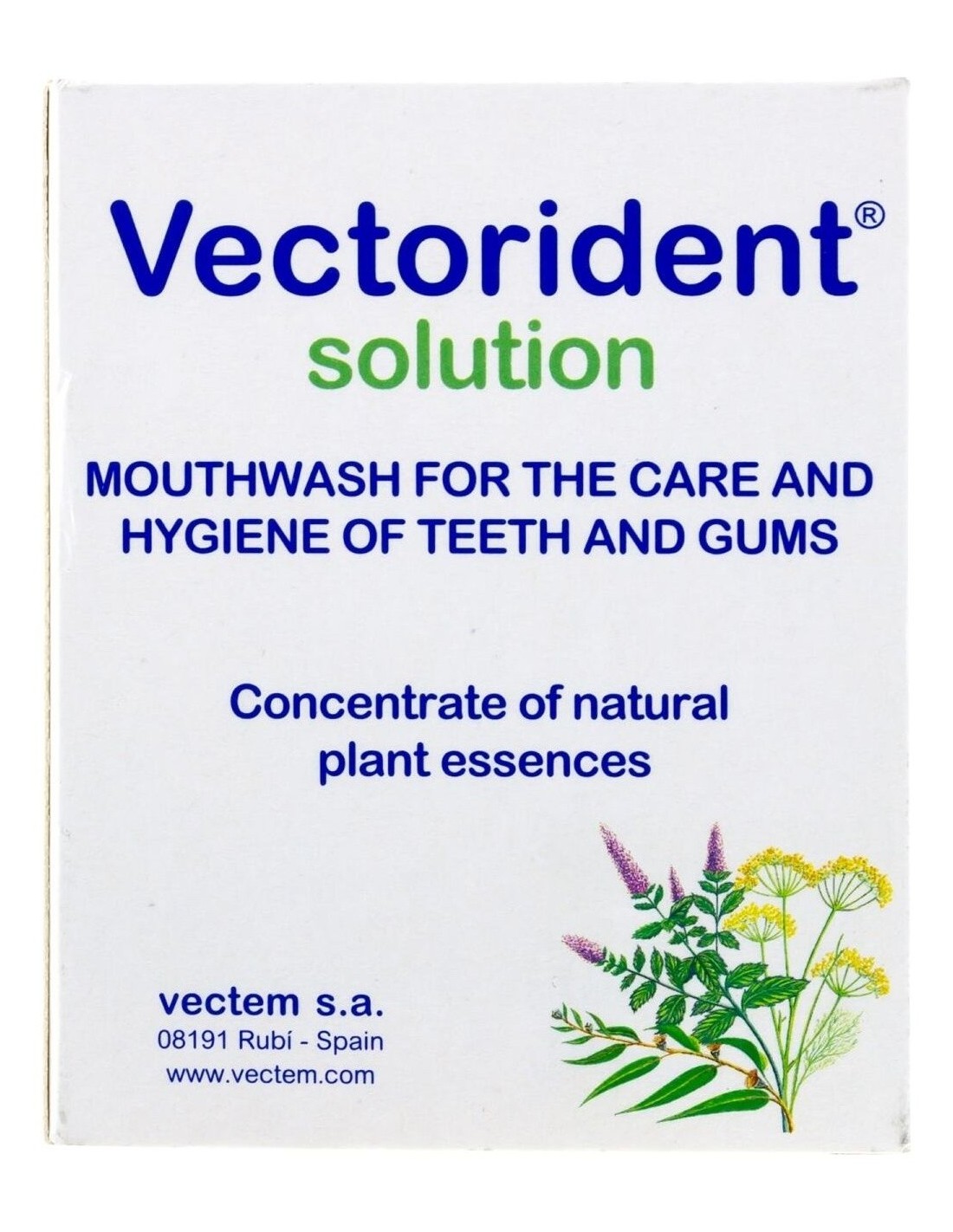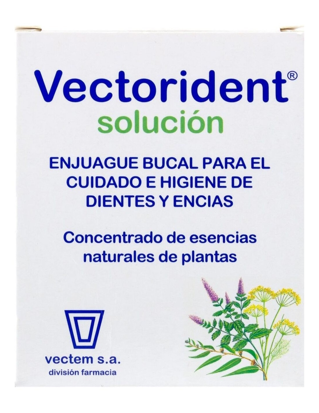 Solución concentrada de aceites esenciales de plantas para usar diluida en agua como enjuague de boca para el cuidado e higiene de dientes y encías.