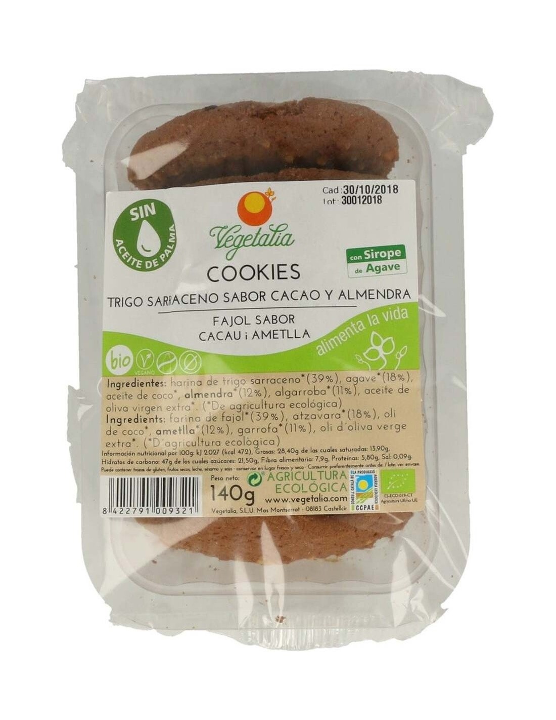 VEGETALIAGalletas de trigo sarraceno, harina de algarroba y almendras, 100% de los ingredientes proceden de cultivos ecológicos. Elaboradas con aceite de coco, aceite de oliva virgen extra, harina de trigo sarraceno, agave, algarroba y almendras enteras.