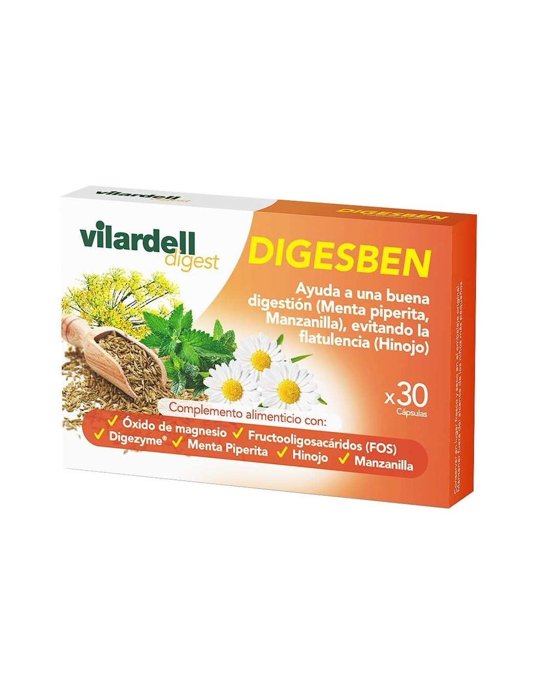 Vilardell Digest Digesben contiene el complejo multi-enzimatico DigeZyme® con una gran cantidad de amilasa, beta-D-galactosidasa, celulasa, lipasa y proteasa. Este grupo de enzimas ayuda a la digestión de los hidratos de carbono, proteínas y grasas siendo además resistente a la acción de los jugos gástricos, manteniendo toda su actividad digestiva. El Hinojo ayuda a evitar las flatulencias favoreciendo la digestión. Los Fructooligosacáridos facilitan la digestión y estimulan el crecimiento de la microbiota intestinal benéfica (efecto prebiótico).